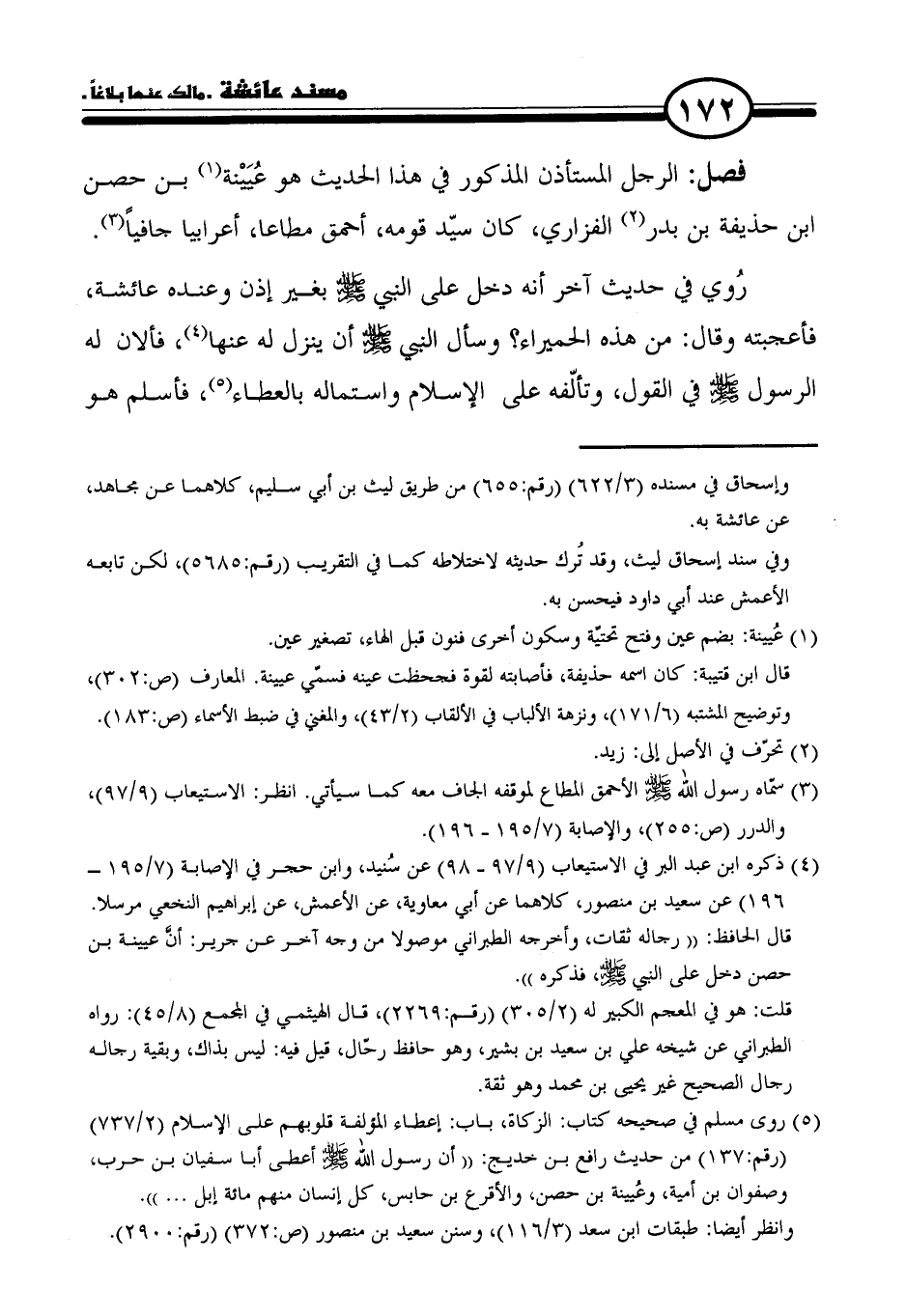 قال الحافظ: "رجاله ثقات، وأخرجه الطبراني موصولا من وجه آخر عن جرير: أنَّ عيينة بن حصن دخل على النبي - صلى الله عليه وسلم -، فذكره".