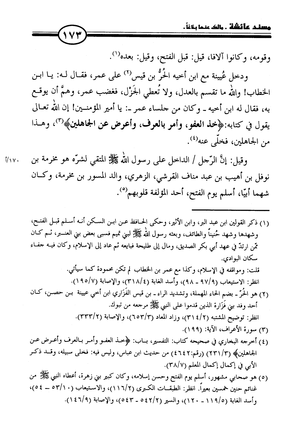 ودخل عُيينة مع ابن أخيه الحُرُّ بن قيس (٢) على عمر، فقال له: يا ابن الخطاب! والله ما تقسم بالعدل، ولا تُعطي الجَزْل، فغضب عمر، وهمَّ أن يوقع به، فقال له ابن أخيه -وكان من جلساء عمر-: يا أمير المؤمنين! إن الله تعالى يقول في كتابه: {خُذِ الْعَفْوَ وَأْمُرْ بِالْعُرْفِ وَأَعْرِضْ عَنِ الْجَاهِلِينَ} (٣)، وهذا من الجاهلين، فخلّى عنه (٤).