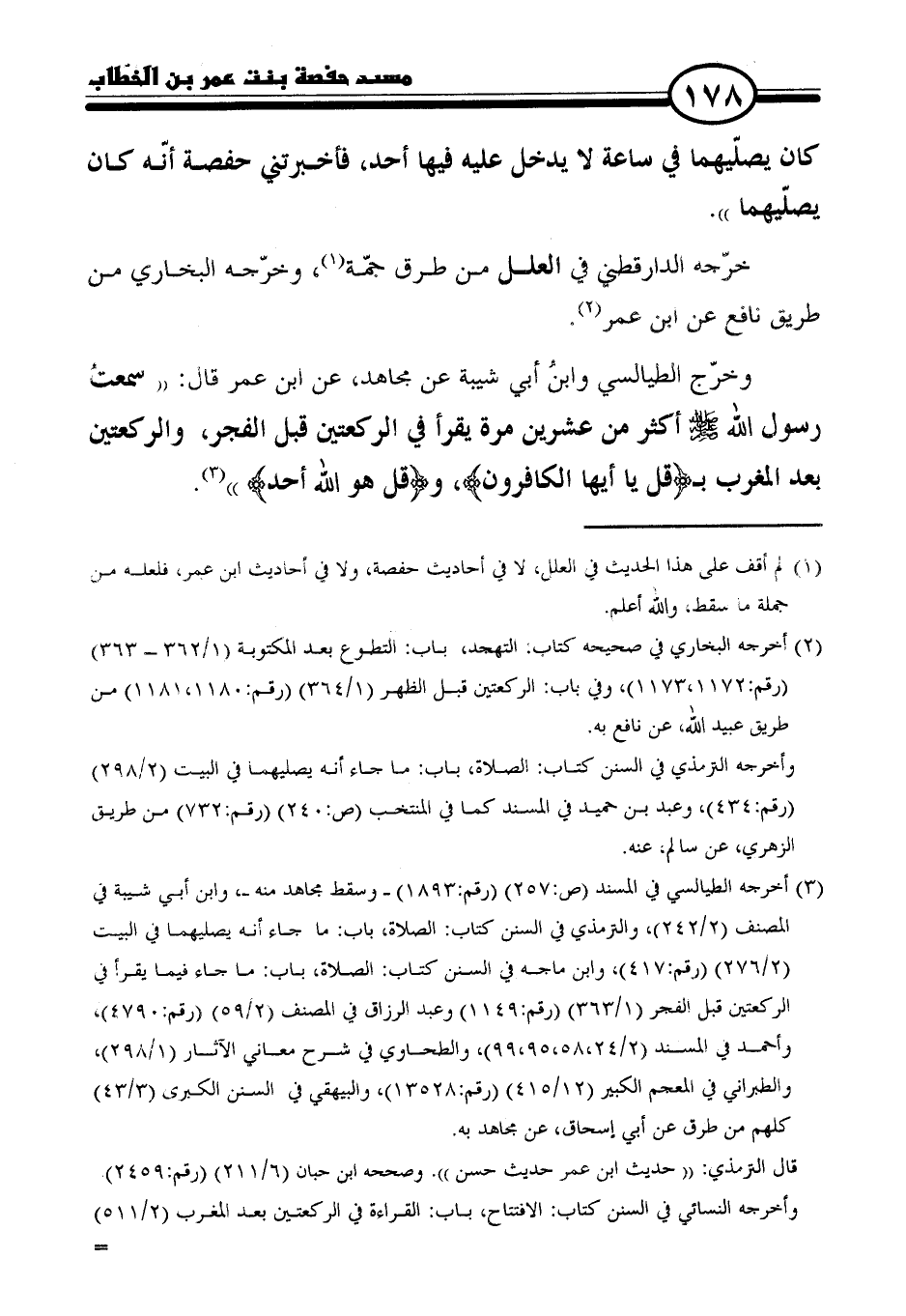(١) لم أقف على هذا الحديث في العل, لا في أحاديث حفصة، ولا في أحاديث ابن عمر، فلعله من جملة ما سقط, والله أعلم.
