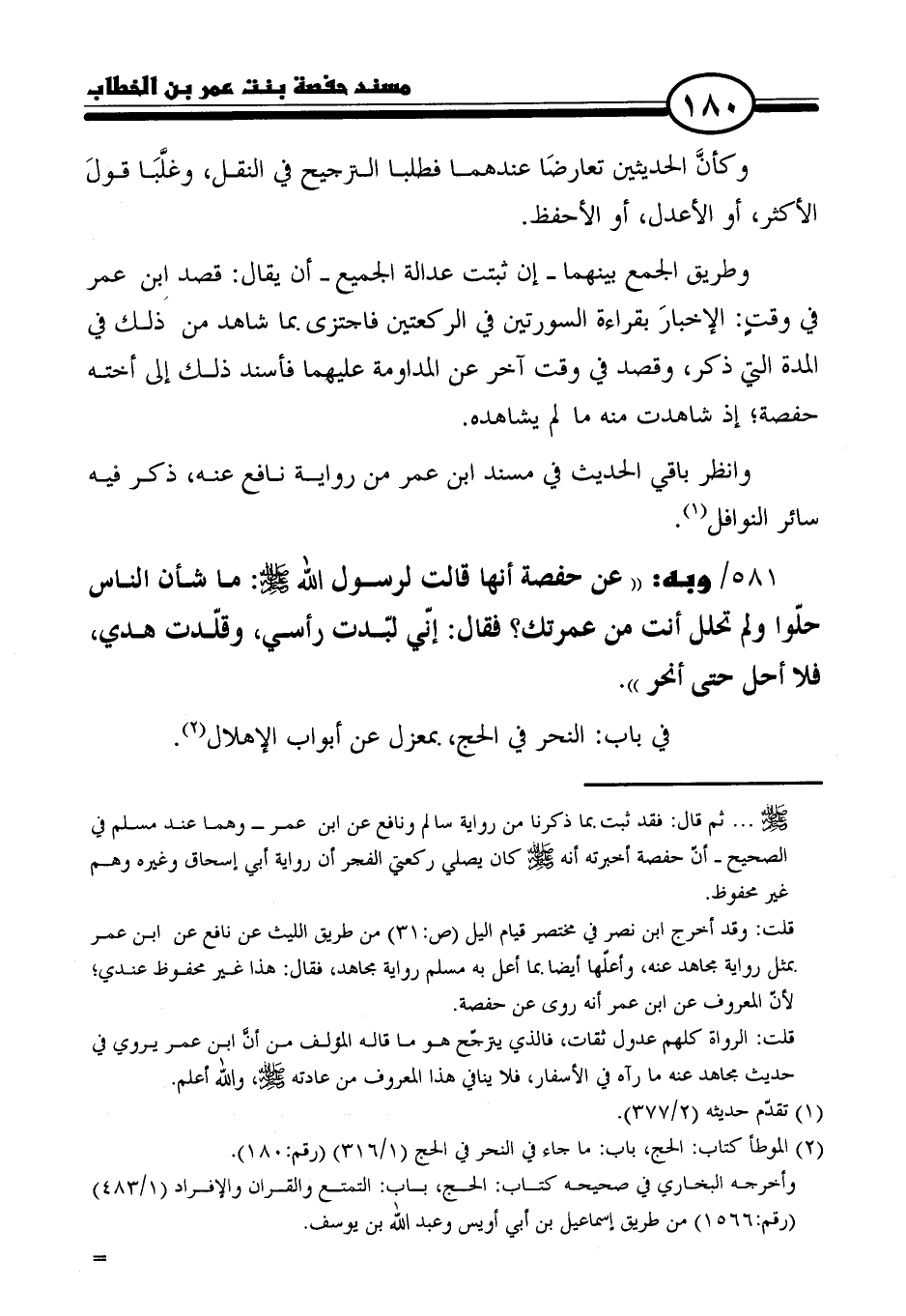 ٥٨١ / وبه: "عن حفصة أنها قالت لرسول الله - صلى الله عليه وسلم -: ما شأن الناس حلّوا ولم تحلل أنت من عمرتك؟ فقال: إني لبّدت رأسي، وقلّدت هدي، فلا أحل حتى أنحر".