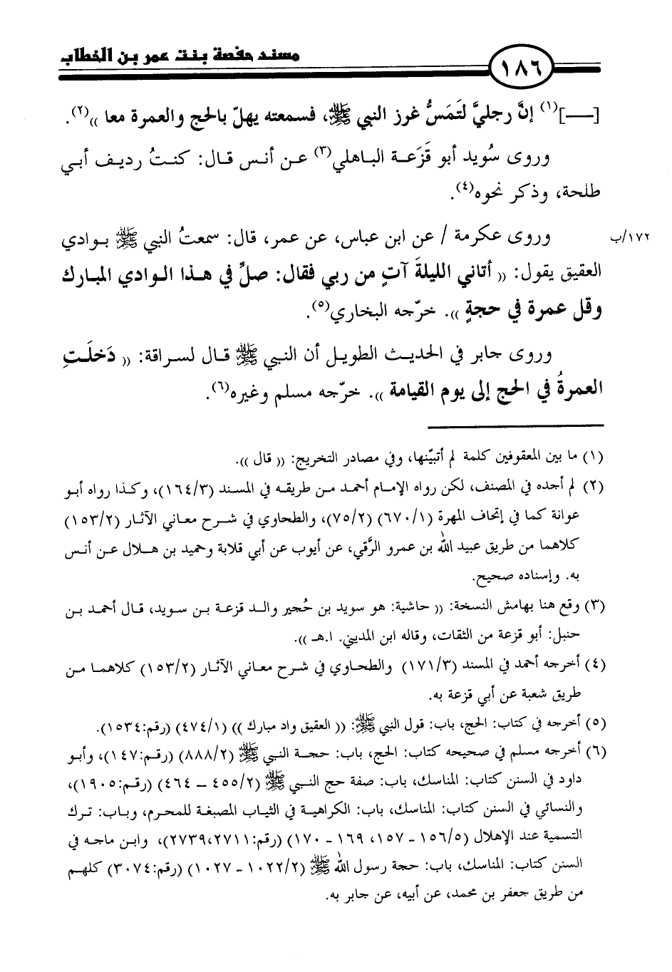 [-] (١) إنَّ رجليَّ لتَمَسُّ غرز النبي - صلى الله عليه وسلم -، فسمعته يهلّ بالحج والعمرة معا" (٢).