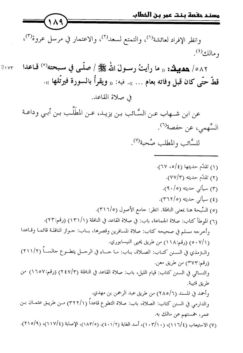 ٥٨٢ / حديث: "ما رأيتُ رسولَ الله - صلى الله عليه وسلم - صلّى في سبحته (٥) قاعدا قطّ حتّى كان قبل وفاته بعام ... ". فيه: "ويقرأُ بالسورة فيرتّلها".