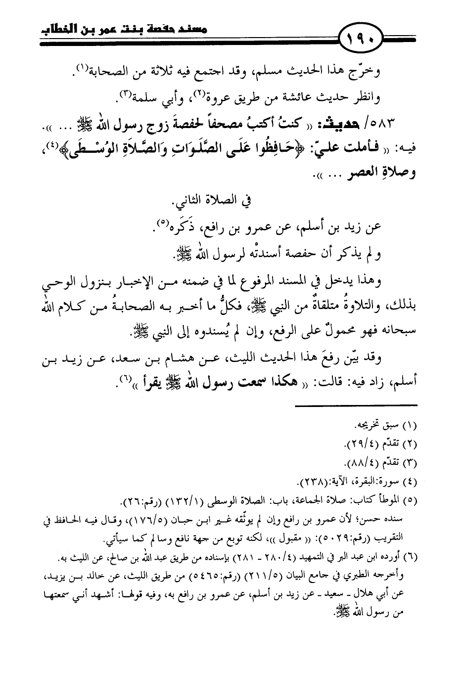 ٥٨٣ / حديث: "كنتُ أكتبُ مصحفًا لحفصةَ زوج رسول الله - صلى الله عليه وسلم - ... ". فيه: "فأملت عليّ: {حَافِظُوا عَلَى الصَّلَوَاتِ وَالصَّلَاةِ الْوُسْطَى} (٤)، وصلاةِ العصر ... ".