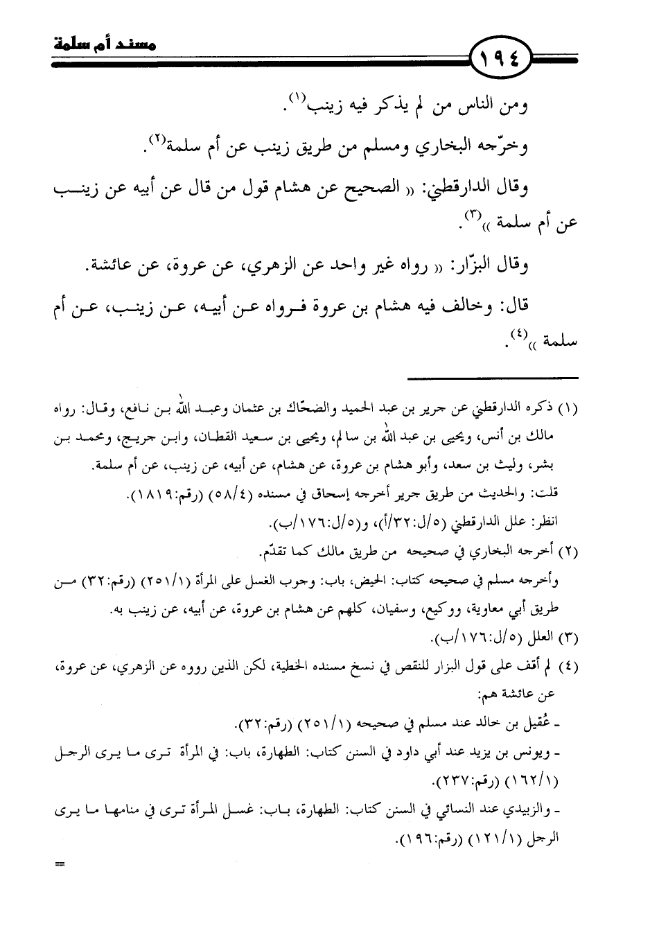 (١) ذكره الدارقطني عن جرير بن عبد الحميد والضحّاك بن عثمان وعبد الله بن نافع، وقال: رواه مالك بن أنس، ويحيى بن عبد الله بن سالم، ويحيى بن سعيد القطان، وابن جريج، ومحمد بن بشر، وليث بن سعد، وأبو هشام بن عروة، عن هشام، عن أبيه، عن زينب، عن أم سلمة.