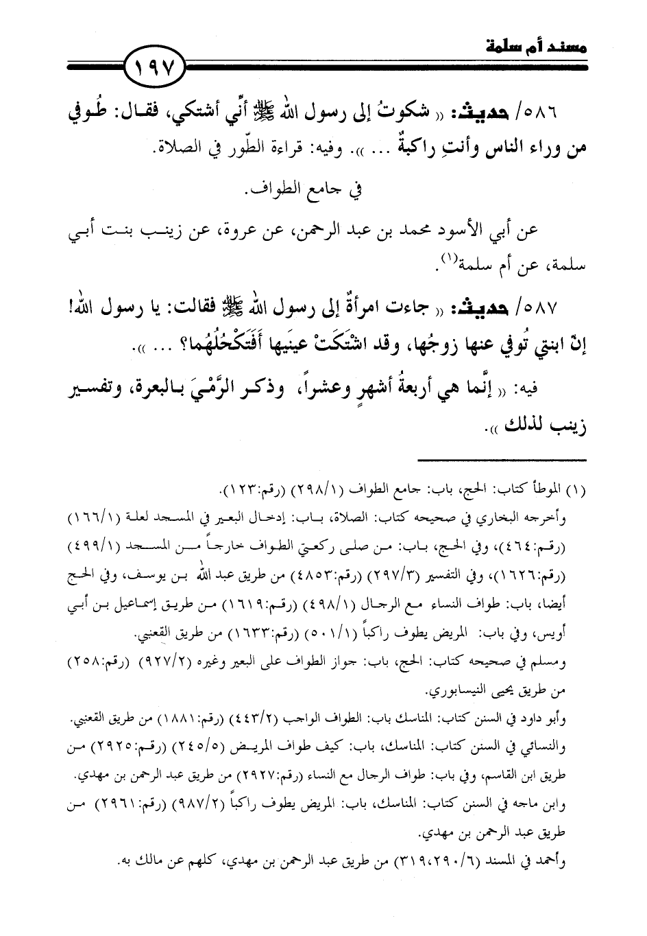 ٥٨٦ / حديث: "شكوتُ إلى رسول الله - صلى الله عليه وسلم - أنِّي أشتكي، فقال: طُوفي من وراء الناس وأنتِ راكبةٌ ... ". وفيه: قراءة الطّور في الصلاة.