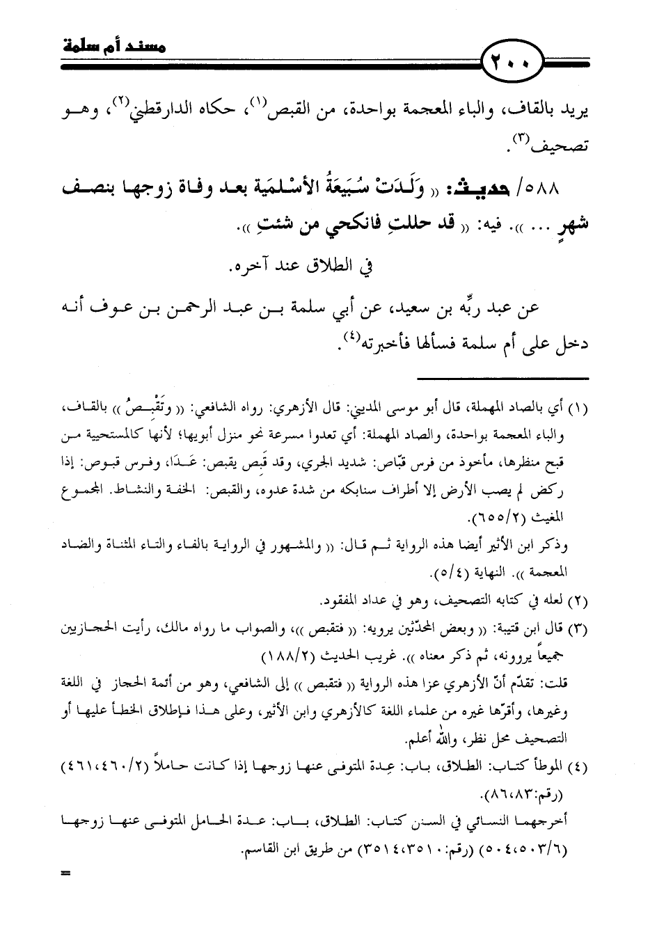٥٨٨ / حديث: "وَلَدَتْ سُبَيعَةُ الأسْلمَية بعد وفاة زوجها بنصف شهرٍ ... ". فيه: "قد حللتِ فانكحي من شئتِ".