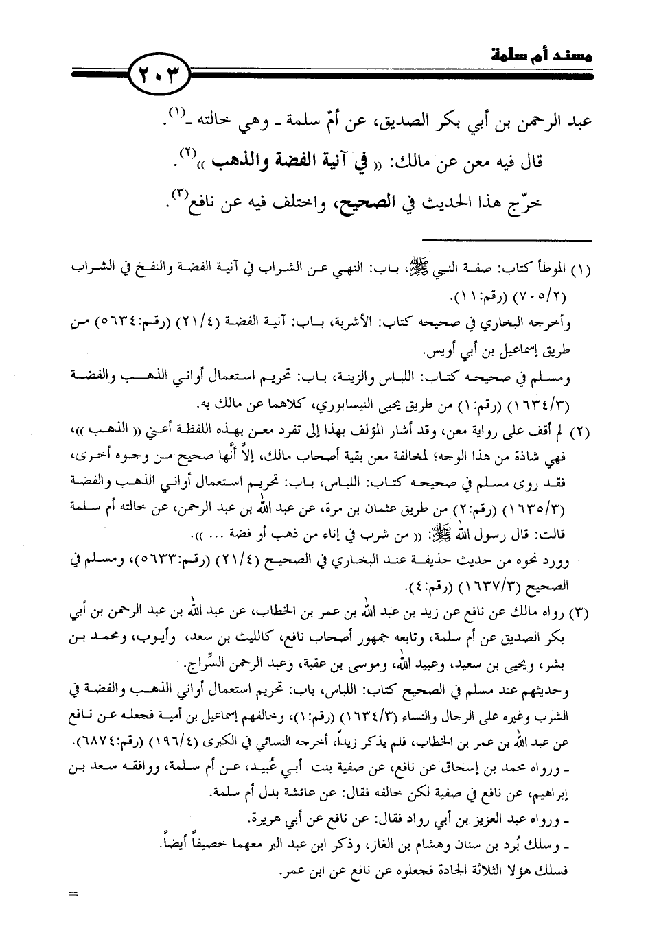 (٣) رواه مالك عن نافع عن زيد بن عبد الله بن عمر بن الخطاب، عن عبد الله بن عبد الرحمن بن أبي بكر الصديق عن أم سلمة، وتابعه جمهور أصحاب نافع، كالليث بن سعد، وأيوب، ومحمد بن بشر، ويحيى بن سعيد، وعبيد الله، وموسى بن عقبة، وعبد الرحمن السِّراج.
