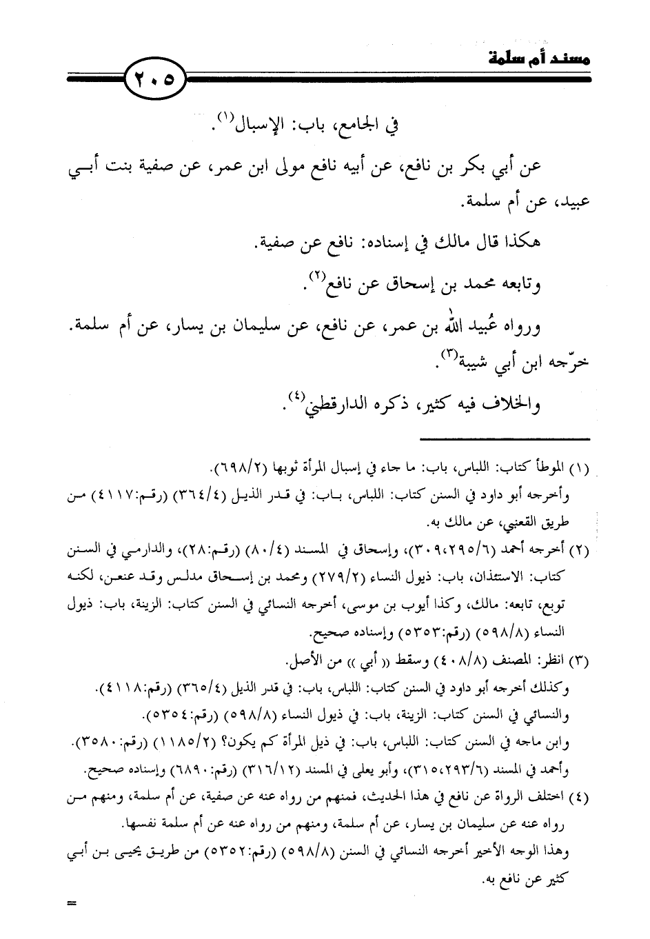 (٤) اختلف الرواة عن نافع في هذا الحديث، فمنهم من رواه عنه عن صفية، عن أم سلمة، ومنهم من رواه عنه عن سليمان بن يسار، عن أم سلمة، ومنهم من رواه عنه عن أم سلمة نفسها.