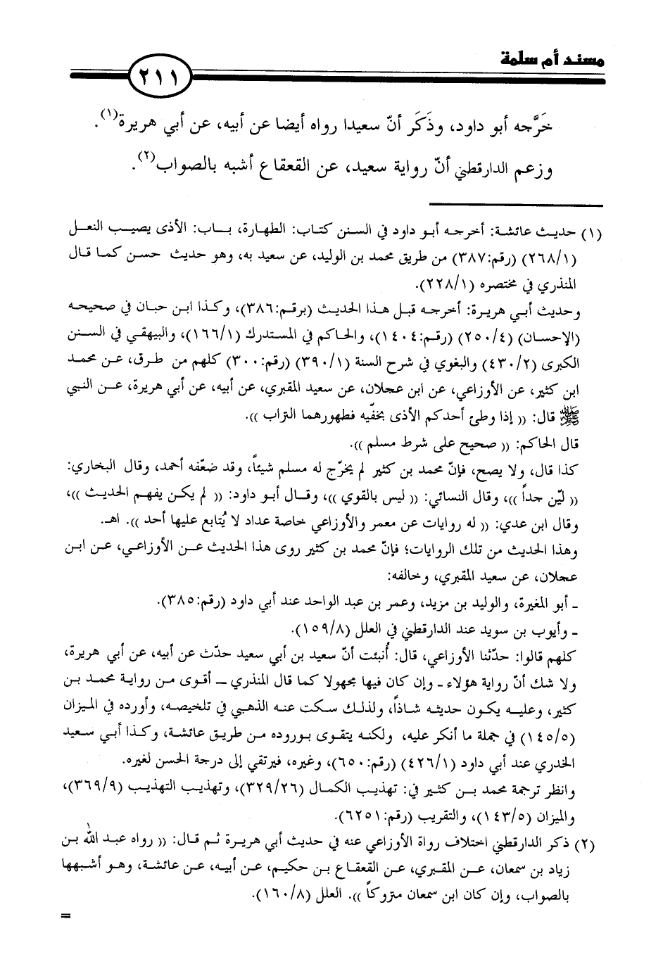 (١) حديث عائشة: أخرجه أبو داود في السنن كتاب: الطهارة، باب: الأذى يصيب النعل (١/ ٢٦٨) (رقم: ٣٨٧) من طريق محمد بن الوليد، عن سعيد به، وهو حديث حسن كما قال المنذري في مختصره (١/ ٢٢٨).