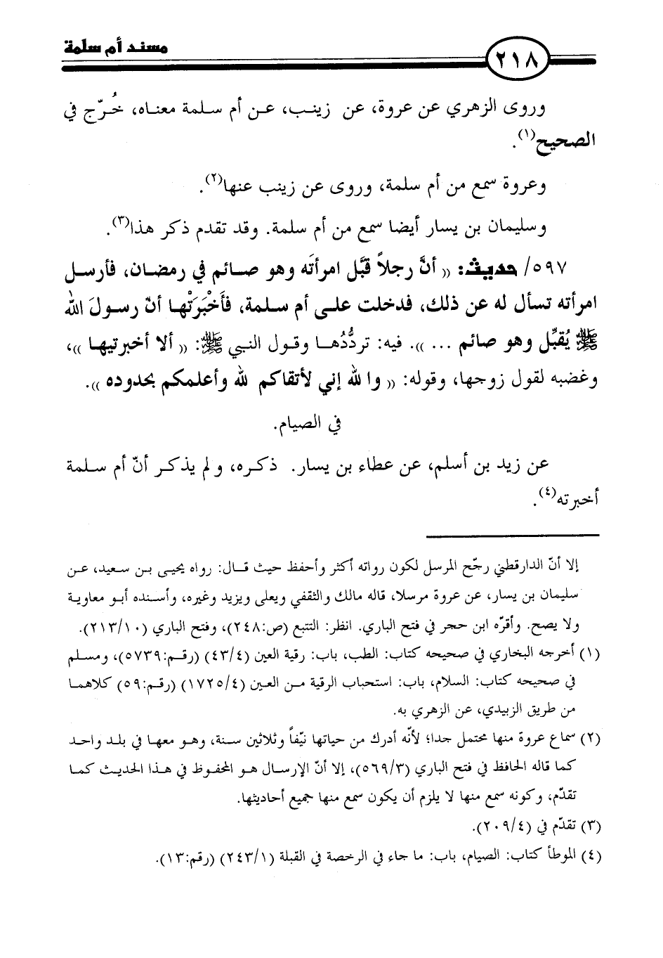 ٥٩٧ / حديث: "أن رجلًا قبَّل امرأتَه وهو صائم في رمضان، فأرسل امرأته تسأل له عن ذلك، فدخلت علي أم سلمة، فأَخْبَرَتْها أنّ رسولَ الله - صلى الله عليه وسلم - يُقبِّل وهو صائم ... ". فيه: تردُّدُها وقول النبي - صلى الله عليه وسلم -: "ألا أخبرتيهما"، وغضبه لقول زوجها، وقوله: "والله إني لأتقاكم لله وأعلمكم بحدوده".