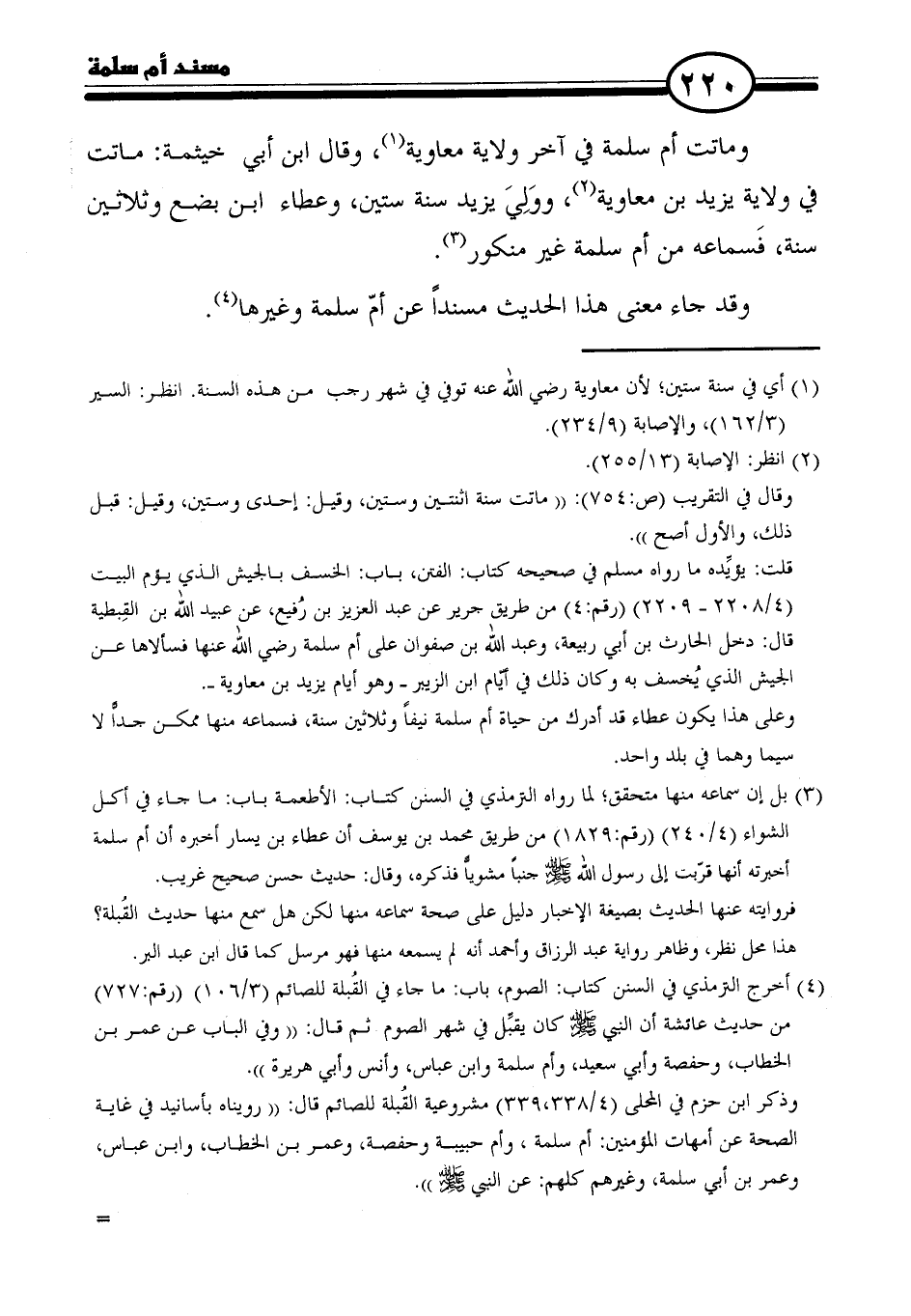 وماتت أم سلمة في آخر ولاية معاوية (١)، وقال ابن أبي خيثمة: ماتت في ولاية يزيد بن معاوية (٢)، ووَلِيَ يزيد سنة ستين، وعطاء ابن بضع وثلاثين سنة، فَسماعه من أم سلمة غير منكور (٣).
