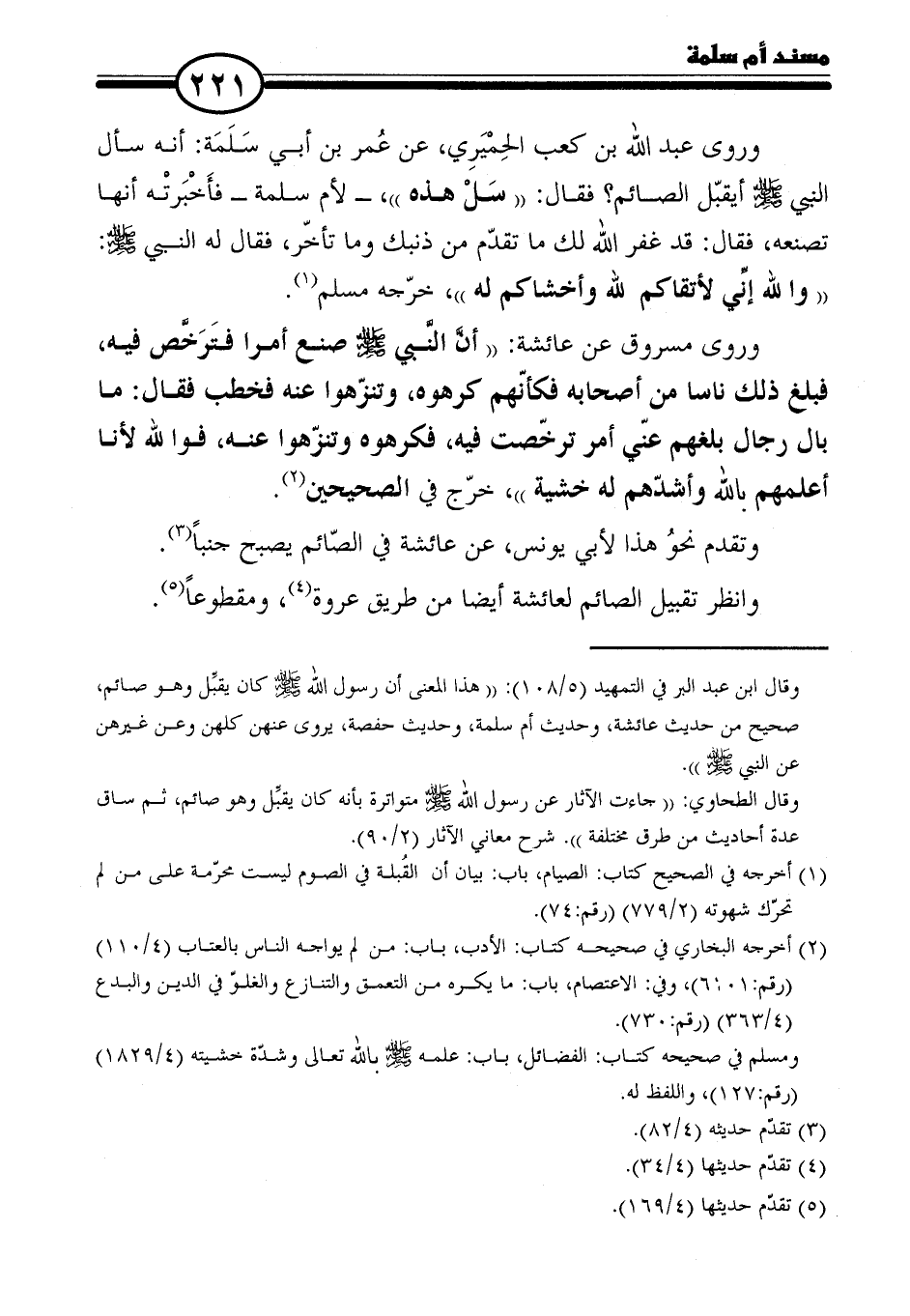 = وقال ابن عبد البر في التمهيد (٥/ ١٠٨): "هذا المعنى أن رسول - صلى الله عليه وسلم - كان يقبِّل وهو صائم، صحيح من حديث عائشة، وحديث أم سلمة، وحديث حفصة، يروي عنهن كلهن وعن غيرهن عن النبي - صلى الله عليه وسلم -".