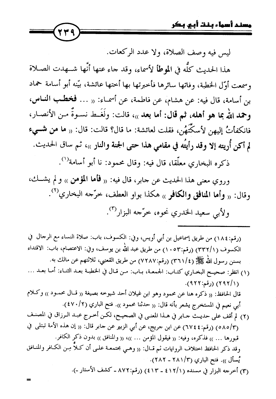 هذا الحديث كلّه في الموطأ لأسماء، وقد جاء عنها أنَّها شهدت الصلاة وسمعت أوّل الخطة، وفاتها سائرها فأخبرتها بها أختها عائشة، بيّنه أبو أسامة حماد بن أسامة، قال فيه: عن هشام، عن فاطمة، عن أسماء: " ... فخطب الناس، وحمد الله بما هو أهله، ثم قال: أما بعد"، قالت: ولَغَط نسوةٌ من الأنصار، فانكفأتُ إليهن لأسكِّتَهَن، فقلت لعائشة: ما قال: قالت: قال: "ما من شيء لم أكن أُريته إلا وقد رأيتُه في مقامي هذا حتى الجنة والنار"، ثم ساق الحديث.
