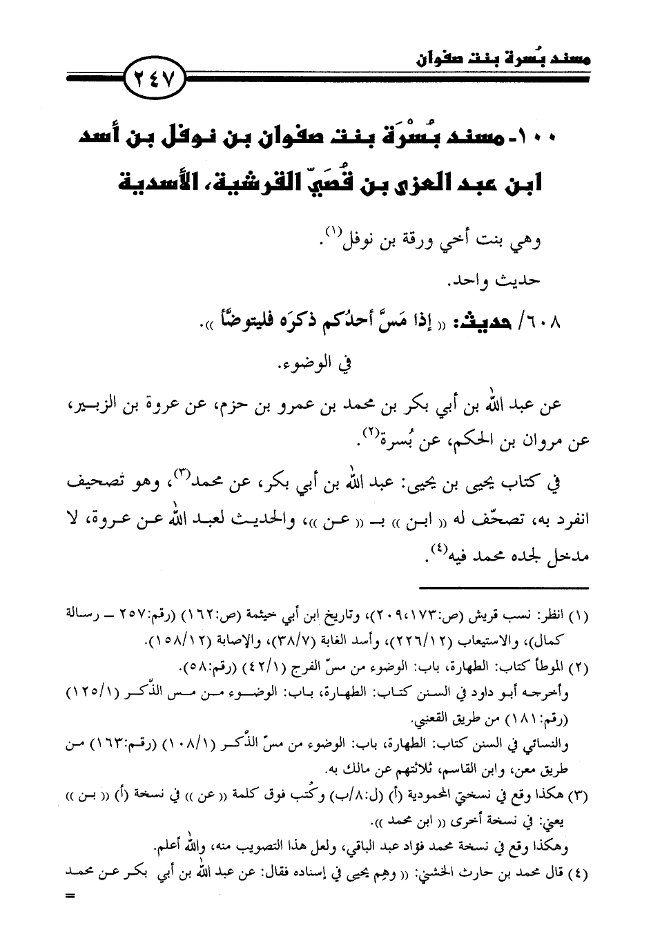 ١٠٠ - مسند بُسْرَة بنت صفوان بن نوفل بن أسد بن عبد العزى بن قُصَيّ القرشية، الأسدية