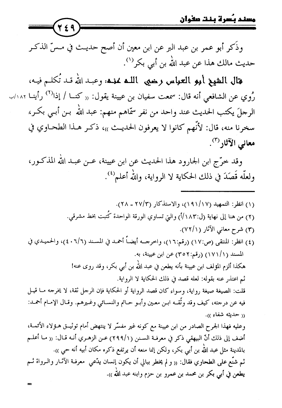 قال الشيخ أبو العباس رضي الله عنه: وعبد الله قد تُكلم فيه، رُوي عن الشافعي أنه قال: سمعت سفيان بن عيينة يقول: "كنا إذا (٢) رأينا الرجلَ يكتب الحديث عند واحد من نفر سمّاهم منهم: عبد الله بن أبي بكر، سخرنا منه، قال: لأنّهم كانوا لا يعرفون الحديث"، ذكر هذا الطحاوي في معاني الآثار (٣).