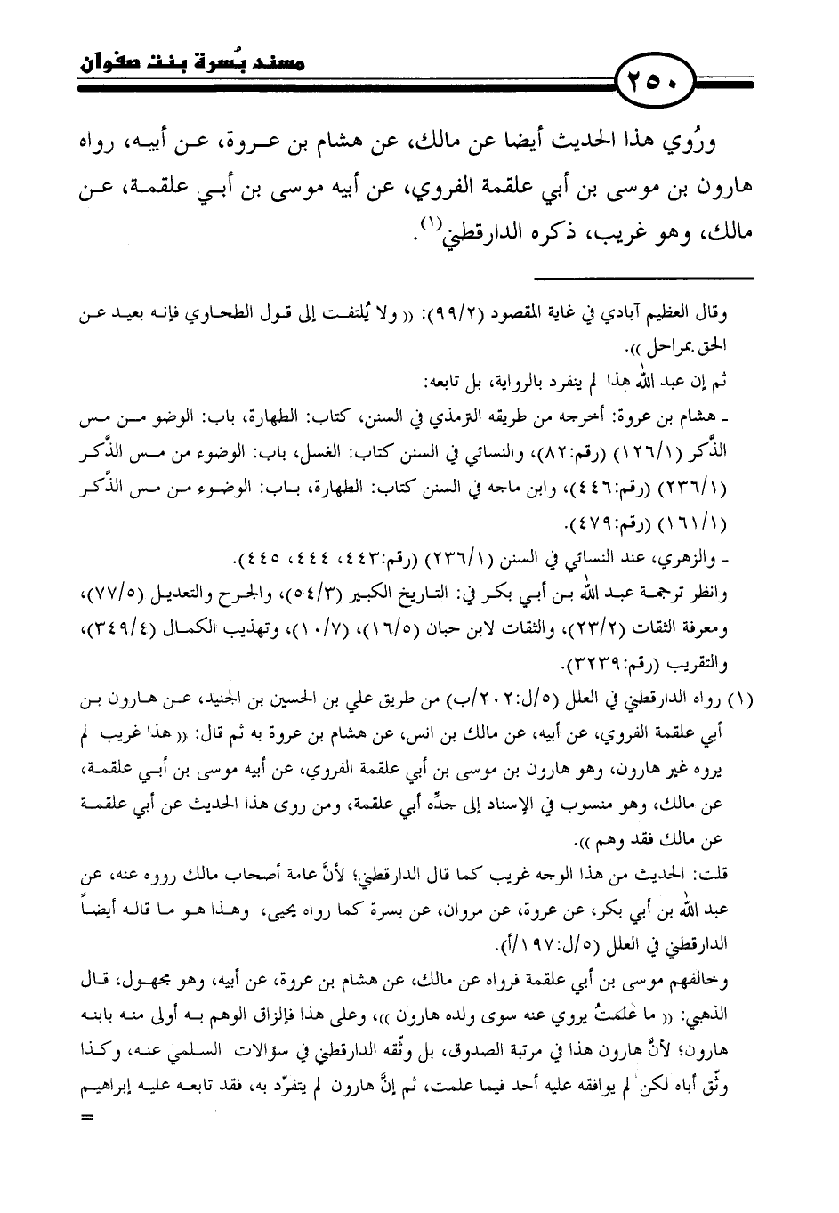قلت: الحديث من هذا الوجه غريب كما قال الدارقطني؛ لأنَّ عامة أصحاب مالك رووه عنه، عنِ عبد الله بن أبي بكر، عن عروة، عن مروان، عن بسرة كما رواه يحيي، وهذا هو ما قاله أيضًا الدارقطني في العلل (٥ / ل: ١٩٧ / أ).