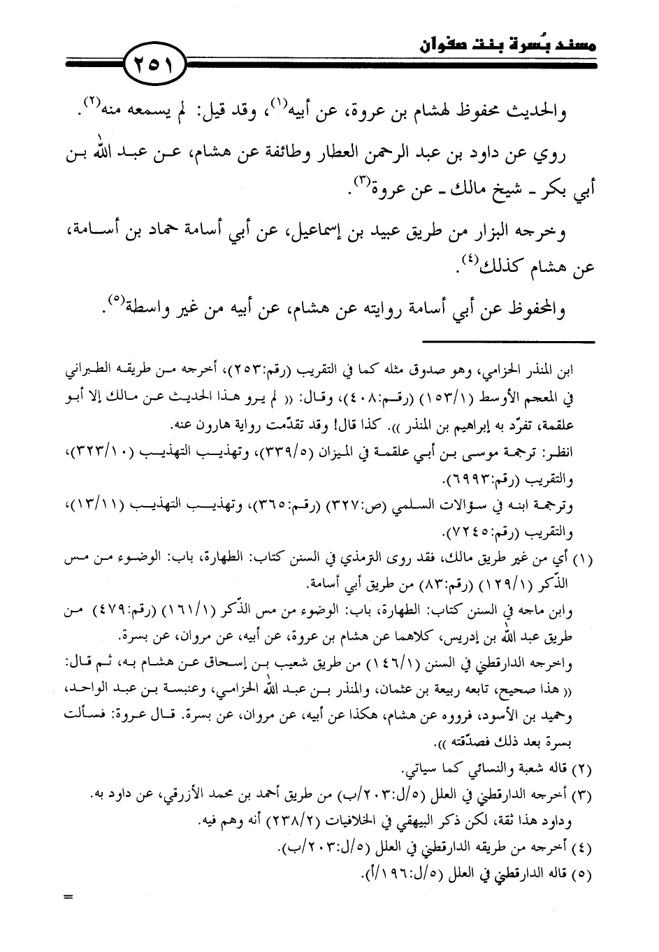 وأخرجه الدارقطني في السنن (١/ ١٤٦) من طريق شعيب بن إسحاق عن هشام به، ثم قال: "هذا صحيح، تابعه ربيعة بن عثمان، والمنذر بن عبد الله الحزامي، وعنبسة بن عبد الواحد، وحميد بن الأسود، فرووه عن هشام، هكذا عن أبيه، عن مروان، عن بسرة. قال عروة: فسألت بسرة بعد ذلك فصدّقته".