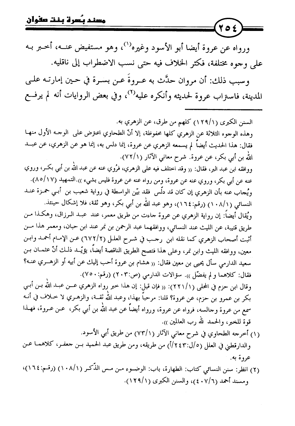 وسبب ذلك: أن مروان حدَّث به عروةَ عن بسرة في حين إمارته علي المدينة، فاستراب عروة لحديثه وأنكره عليه (٢)، وفي بعض الروايات أنه لم يرفع