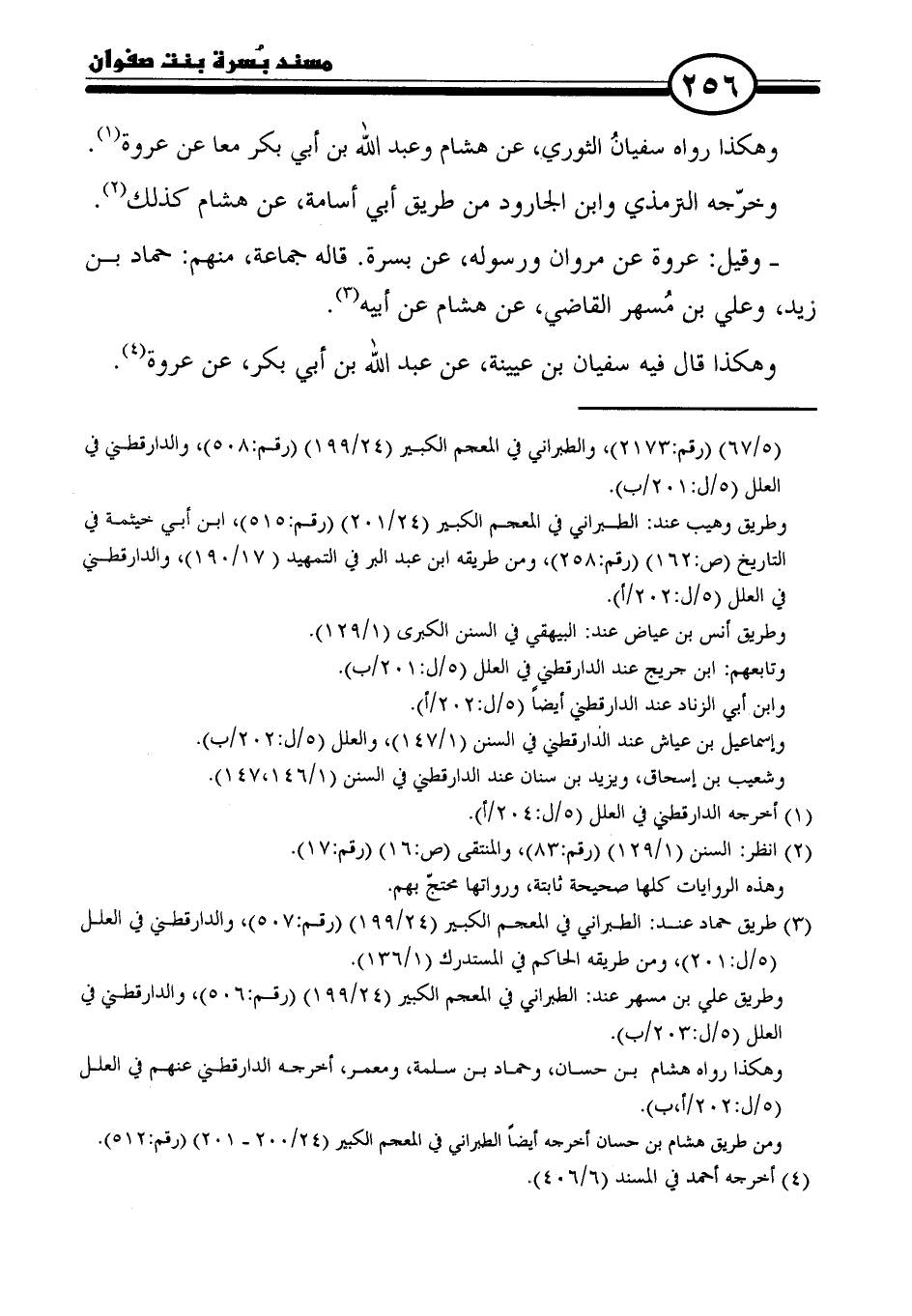- وقيل: عروة عن مروان ورسوله، عن بسرة. قاله جماعة، منهم: حماد بن زيد، وعلي بن مُسهر القاضي، عن هشام عن أبيه (٣).