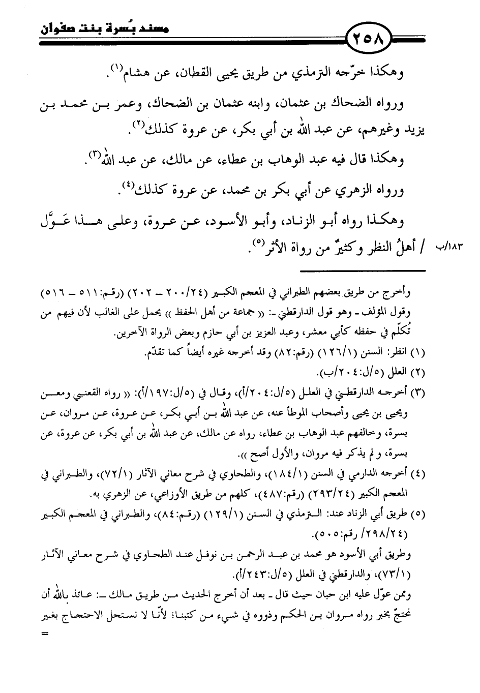 (٣) أخرجه الدارقطني في العلل (٥ / ل: ٢٠٤ / أ)، وقال في (٥ / ل: ١٩٧ / أ): "رواه القعنبي ومعن ويحيى بن يحيى وأصحاب الموطأ عنه، عن عبد الله بن أبي بكر، عن عروة، عن مروان، عن بسرة، وخالفهم عبد الوهاب بن عطاء، رواه عن مالك، عن عبد الله بن أبي بكر، عن عروة، عن بسرة، ولم يذكر فيه مروان، والأول أصح".