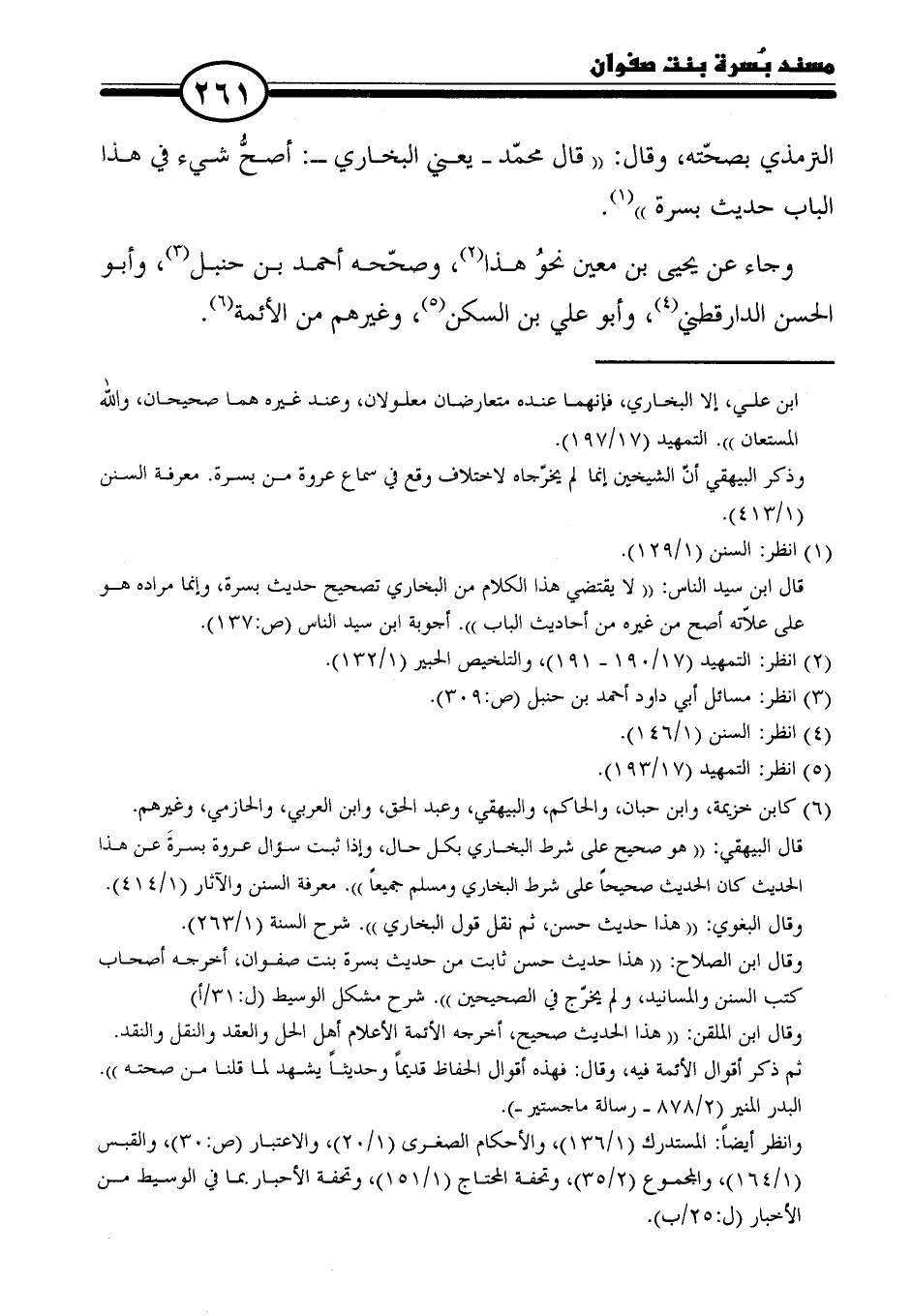 الترمذي بصحّته، وقال: "قال محمّد -يعني البخاري-: أصحُّ شيء في هذا الباب حديث بسرة" (١).
