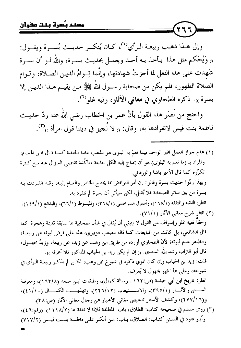 وإلي هذا ذهب ربيعة الرأي (١)، كان يُنكر حديث بُسرة ويقول: "وَيحَكم مثل هذا يأخذ به أحد ويعمل بحديث بسرة، والله لو أن بسرة شَهِدت علي هذا النعل لما أجزتُ شهادتها، وإنَّما قِوامُ الدين الصلاة، وقوام الصلاة الطهور، فلم يكن من صحابة رسول الله - صلى الله عليه وسلم - من يقيم هذا الدين إلا بسرة". ذكره الطحاوي في معاني الآثار، وفيه غلو (٢).