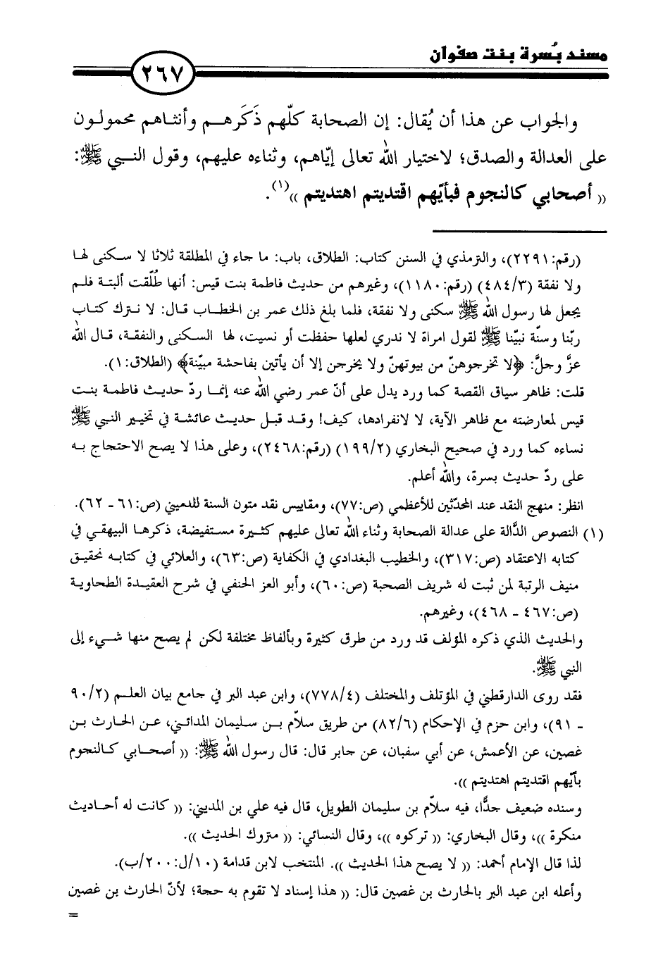 والجواب عن هذا أن يُقال: إن الصحابة كلّهم ذَكَرهم وأنثاهم محمولون على العدالة والصدق: لاختيار الله تعالى إيّاهم، وثناءه عليهم، وقول النَّبِيّ - صلى الله عليه وسلم -: "أصحابي كالنجوم فبأيّهم اقتديتم اهتديتم" (١).