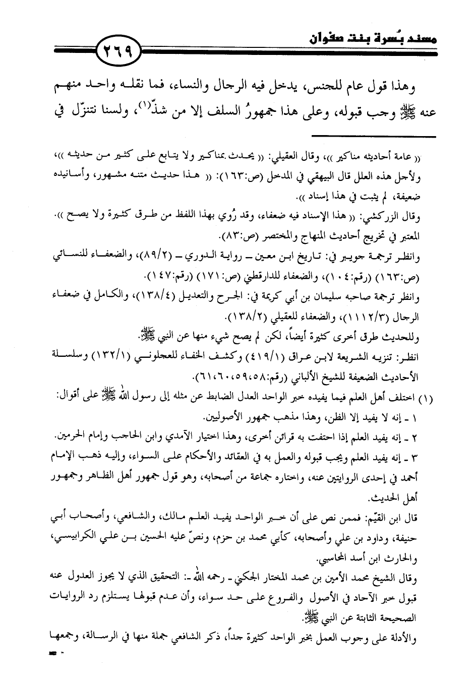 وقال الشيخ محمد الأمين بن محمد المختار الجكني -رحمه الله-: التحقيق الذي لا يجوز العدول عنه قبول خبر الآحاد في الأصول والفروع على حد سواء، وأن عدم قبولها يستلزم رد الروايات الصحيحة الثابتة عن النَّبيِّ - صلى الله عليه وسلم -.