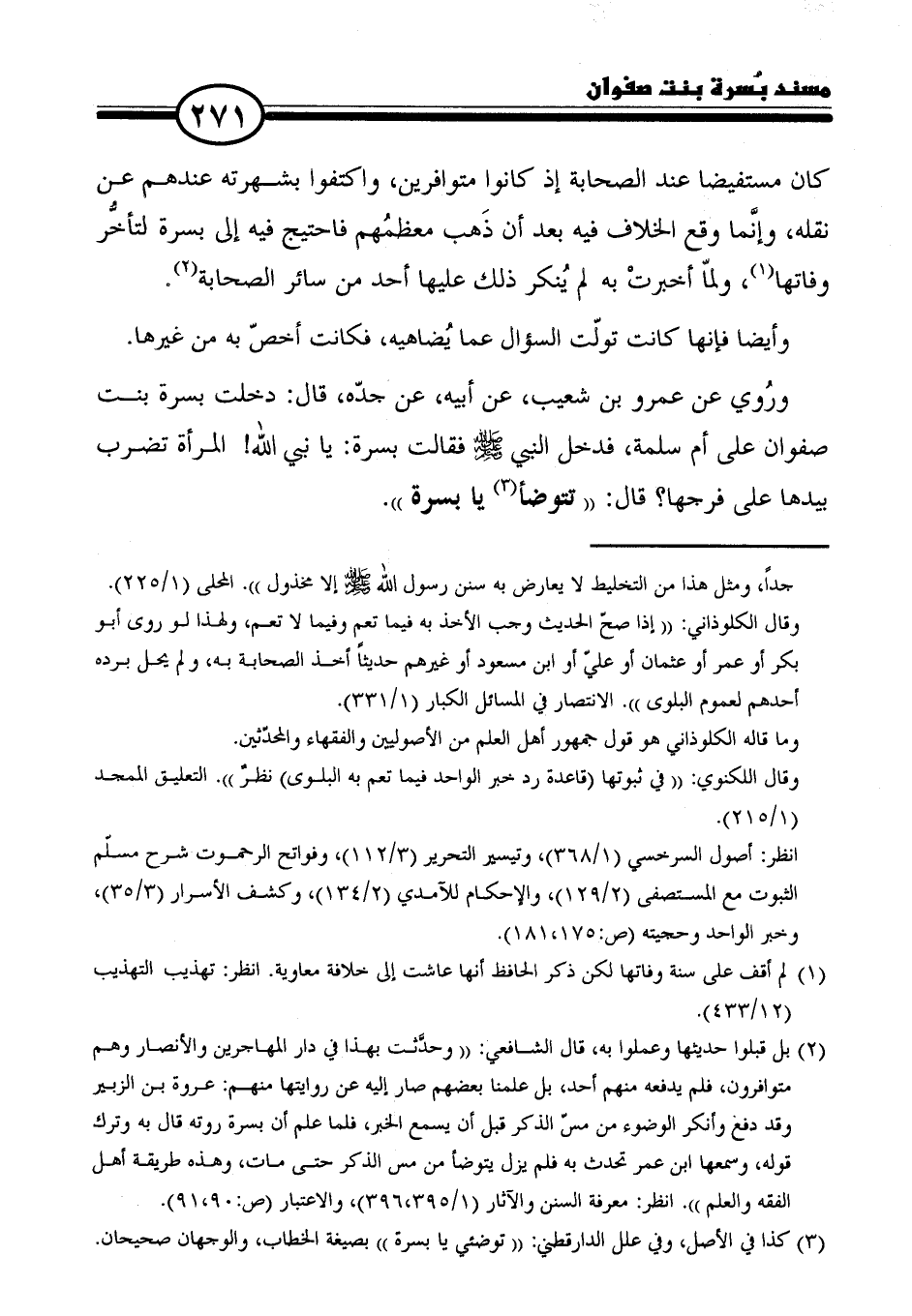 (٢) بل قبلوا حديثها وعملوا به، قال الشافعي: "وحدَّثت بهذا في دار المهاجرين والأنصار وهم متوافرون، فلم يدفعه منهم أحد، بل علمنا بعضهم صار إليه عن روايتها منهم: عروة بن الزبير وقد دفغ وأنكر الوضوء من مسّ الذكر قبل أن يسمع الخبر، فلما علم أن بسرة روته قال به وترك قوله، وسمعها ابن عمر تحدث به فلم يزل يتوضأ من مس الذكر حتى مات، وهذه طريقة أهل الفقه والعلم". انظر: معرفة السنن والآثار (١/ ٣٩٥، ٣٩٦)، والاعتبار (ص: ٩٠، ٩١).