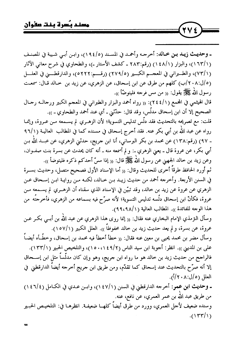 ثم أورد الحافظ طرقًا أخرى للحديث وقال: "أما الإسناد الأول فصحيح متصل، وحديث بسرة في السنن الأربعة. وأخرجه أحمد من حديث زيد بن خالد، لكنه من رواية ابن إسحاق عن الزهري عن عروة عن زيد بن خالد، وقد تبيَّن في الإسناد الذي سقناه أن الزهري لم يسمعه من عروة، فكأن ابن إسحاق دلَّسه تدليس التسوية: لأنه صرَّح فيه بسماعه من الزهري، فأخرجتُه من هذا الوجه للفائدة". المطالب العالية (١/ ٩٨، ٩٩).