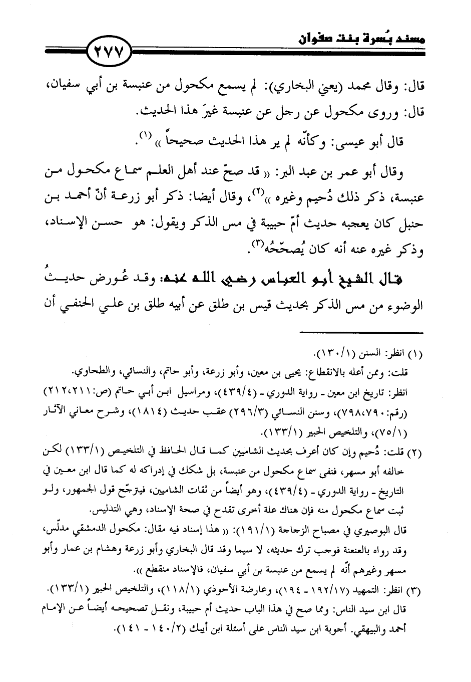 وقال أبو عمر بن عبد البر: "قد صحّ عند أهل العلم سماع مكحول من عنبسة، ذكر ذلك دُحيم وغيرهط (٢)، وقال أيضًا: ذكر أبو زرعة أنّ أحمد بن حنبل كان يعجبه حديث أمّ حبيبة في مس الذكر ويقول: هو حسن الإسناد، وذكر غيره عنه أنه كان يُصحّحُه (٣).