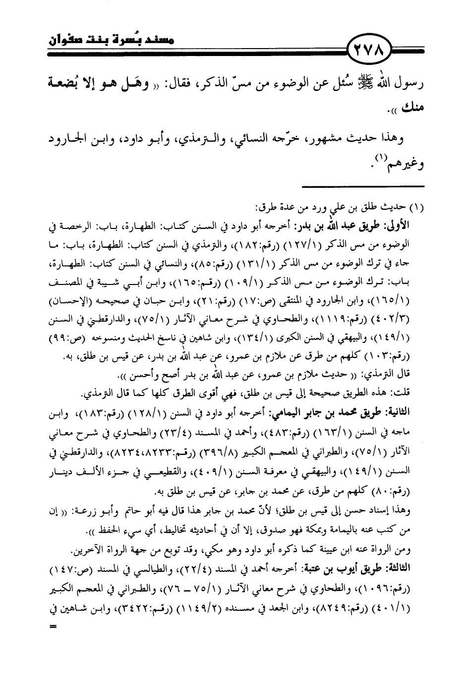 الأولى: طريق عبد الله بن بدر: أخرجه أبو داود في السنن كتاب: الطهارة، باب: الرخصة في الوضوء من مس الذكر (١/ ١٢٧) (رقم: ١٨٢)، والترمذي في السنن كتاب: الطهارة، باب: ما جاء في ترك الوضوء من مس الذكر (١/ ١٣١) (رقم: ٨٥)، والنسائي في السنن كتاب: الطهارة، باب: ترك الوضوء من مس الذكر (١/ ١٠٩) (رقم: ١٦٥)، وابن أبي شيبة في المصنف (١/ ١٦٥)، وابن الجارود في المنتقى (ص: ١٧) (رقم: ٢١)، وابن حبان في صحيحه (الإحسان) (٣/ ٤٠٢) (رقم: ١١١٩)، والطحاوي في شرح معاني الآثار (١/ ٧٥)، والدارقطني في السنن (١/ ١٤٩)، والبيهقي في السنن الكبرى (١/ ١٣٤)، وابن شاهين في ناسخ الحديث ومنسوخه (ص: ٩٩) (رقم: ١٠٣) كلهم من طرق عن ملازم بن عمرو، عن عبد الله بن بدر، عن قيس بن طلق، به.