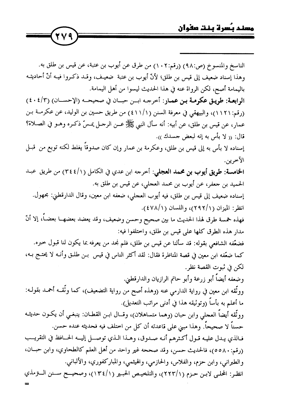 الرابعة: طريق عكرمة بن عمار: أخرجه ابن حبان في صحيحه (الإحسان) (٣/ ٤٠٤) (رقم: ١١٢١)، والبيهقي في معرفة السنن (١/ ٤١١) من طريق حسين بن الوليد، عن عكرمة بن عمار، عن قيس بن طلق، عن أبيه: أنه سأل النَّبيَّ - صلى الله عليه وسلم - عن الرجل يمسّ ذكره وهو في الصلاة: قال: "لا بأس به إِنَّهُ لبعض جسدك".