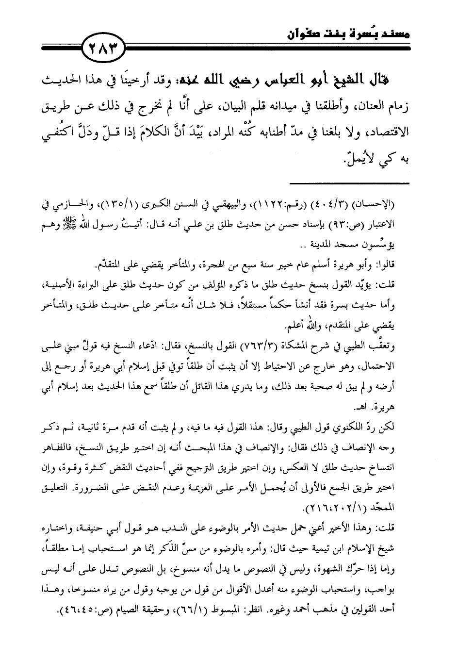 قلت: يؤيِّد القول بنسخ حديث طلق ما ذكره المؤلف من كون حديث طلق على البراءة الأصلية، وأما حديث بسرة فقد أنشأ حكمًا مستقلًا، فلا شك أنّه متأخر على حديث طلق، والمتأخر يقضي على المتقدم، والله أعلم.