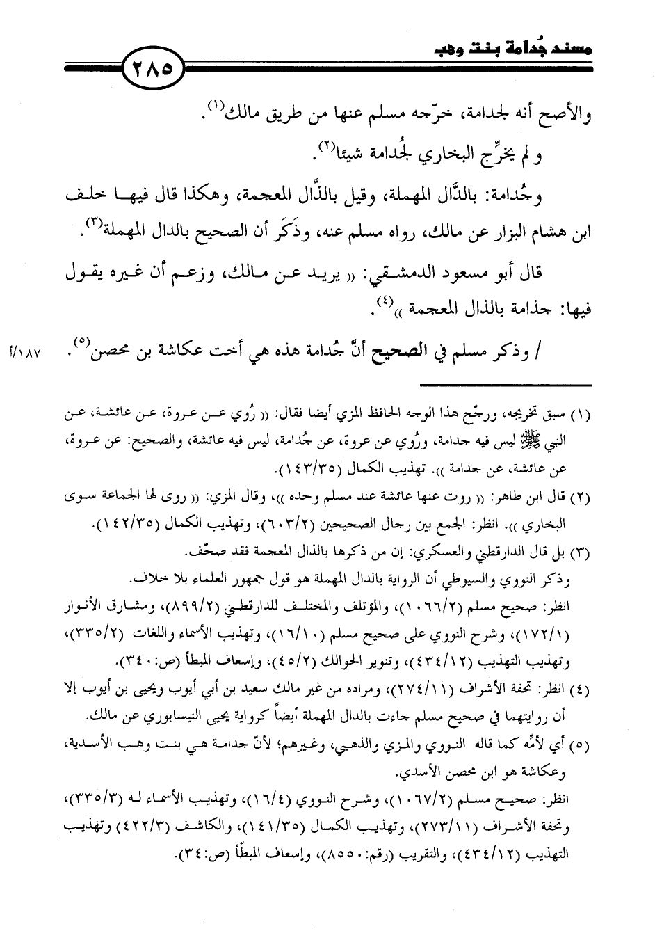 (٥) أي لأمِّه كما قاله النووي والمزي والذهبي، وغيرهم: لأنّ جدامة هي بنت وهب الأسدية، وعكاشة هو ابن محصن الأسدي.