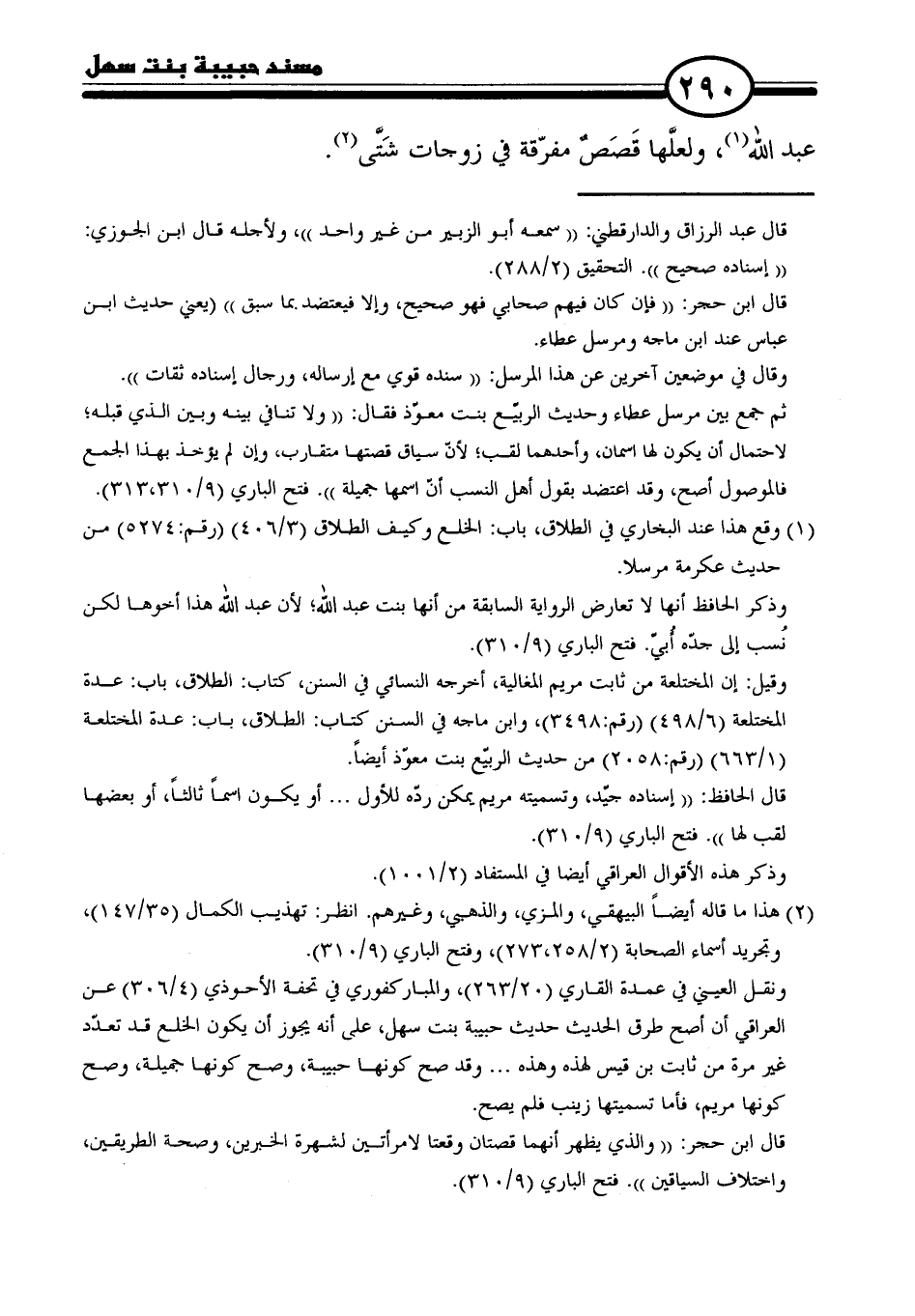 ونقل العيني في عمدة القاري (٢٠/ ٢٦٣)، والمباركفوري في تحفة الأحوذي (٤/ ٣٠٦) عن العراقي أن أصح طرق الحديث حديث حبيبة بنت سهل، على أنه يجوز أن يكون الخلع قد تعدّد غير مرة من ثابت بن قيس لهذه وهذه ... وقد صح كونها حبيبة، وصح كونها جميلة، وصح كونها مريم، فأما تسميتها زينب فلم يصح.