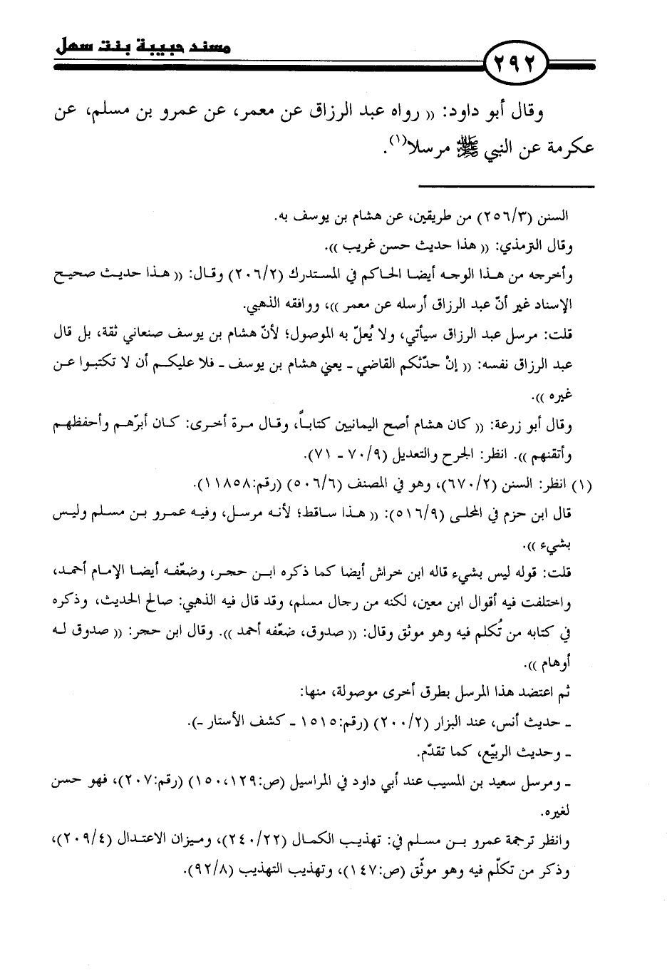 قلت: مرسل عبد الرزاق سيأتي، ولا يُعلّ به الموصول: لأنّ هشام بن يوسف صنعاني ثقة، بل قال عبد الرزاق نفسه: "إنْ حدّثكم القاضي -يعني هشام بن يوسف- فلا عليكم أن لا تكتبوا عن غيره".