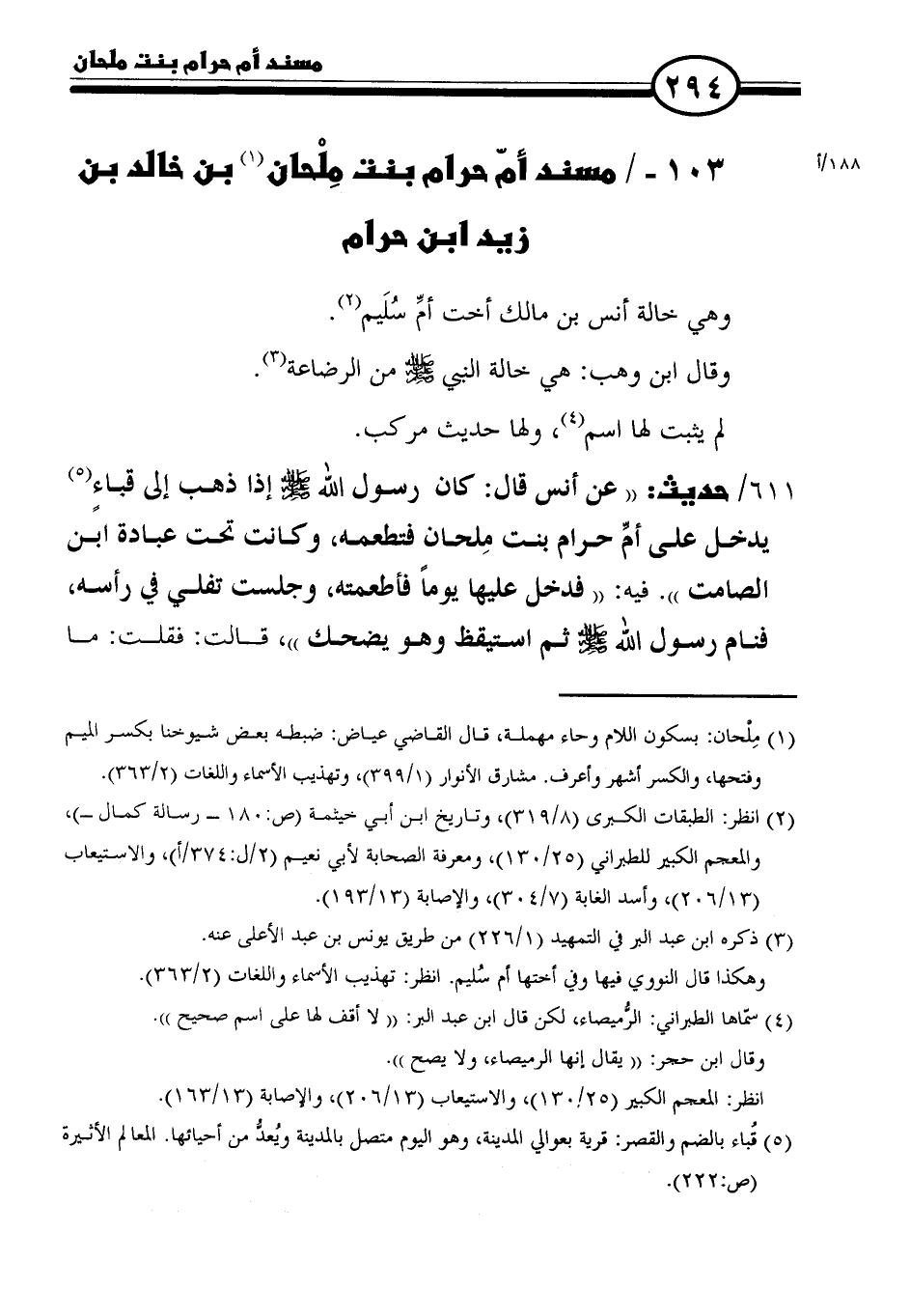 ١٠٣ - مسند أمّ حرام بنت مِلْحان (١) بن خالد بن زيد بن حرام