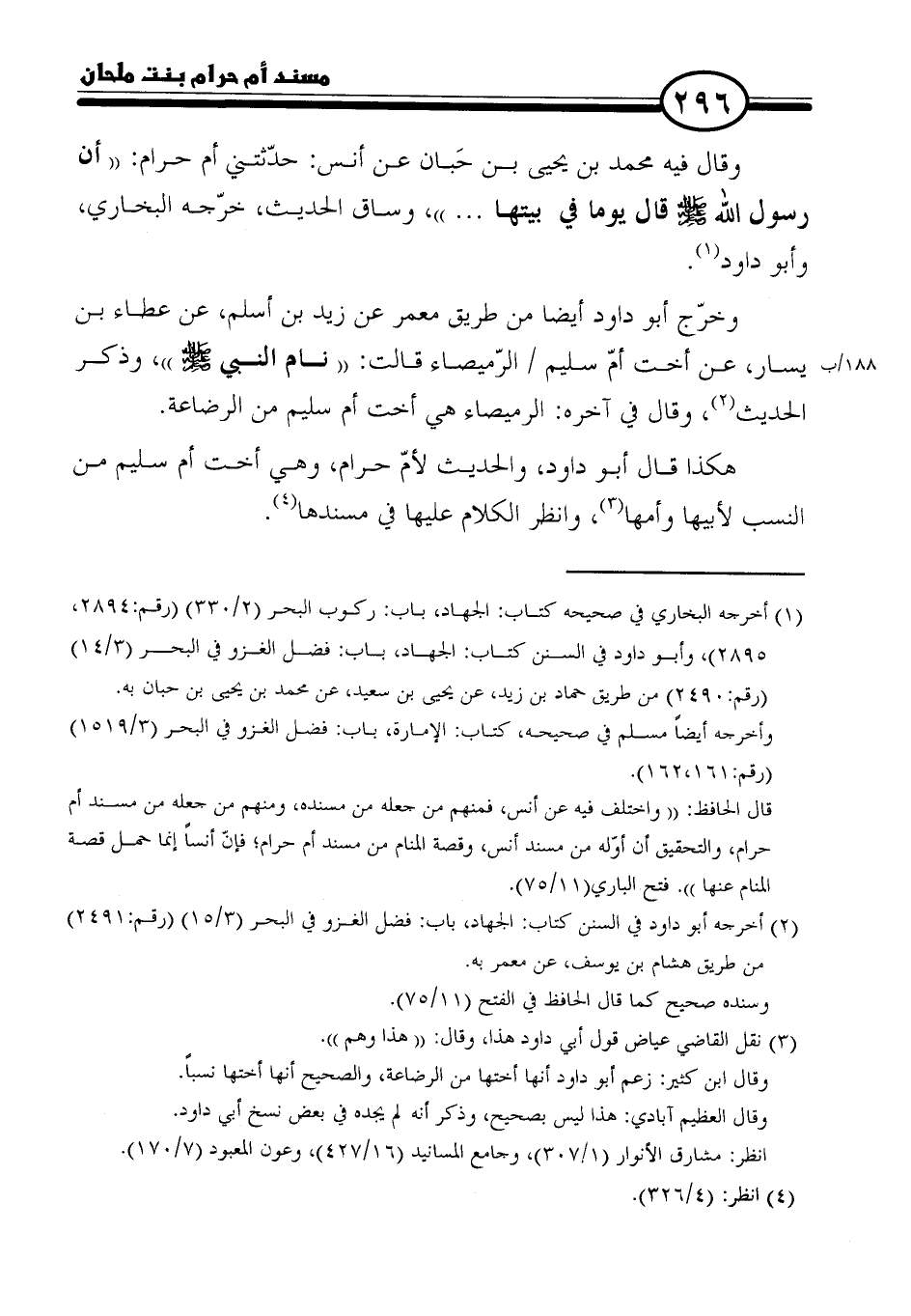 هكذا قال أبو داود، والحديث لأمّ حرام، وهي أخت أم سليم من النسب لأبيها وأمها (٣)، وانظر الكلام عليها في مسندها (٤).