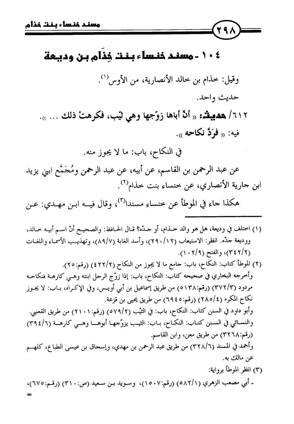 ١٠٤ - مسند خنساء بنت خِذَام بن وديعة