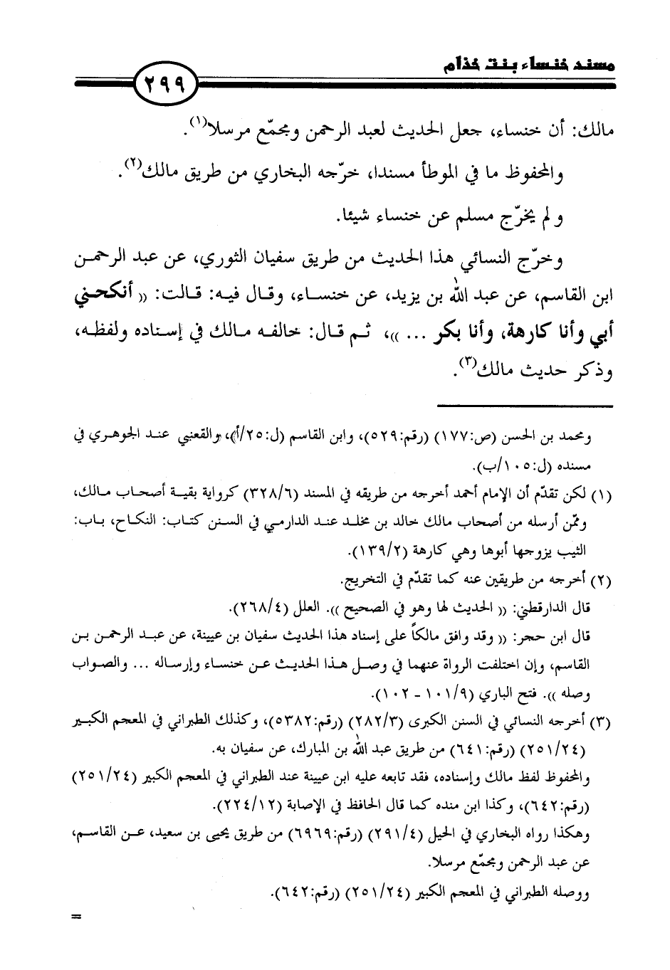 قال ابن حجر: "وقد وافق مالكًا على إسناد هذا الحديث سفيان بن عيينة، عن عبد الرحمن بن القاسم، وإن اختلفت الرواة عنهما في وصل هذا الحديث عن خنساء وإرساله ... والصواب وصله". فتح الباري (٩/ ١٠١ - ١٠٢).