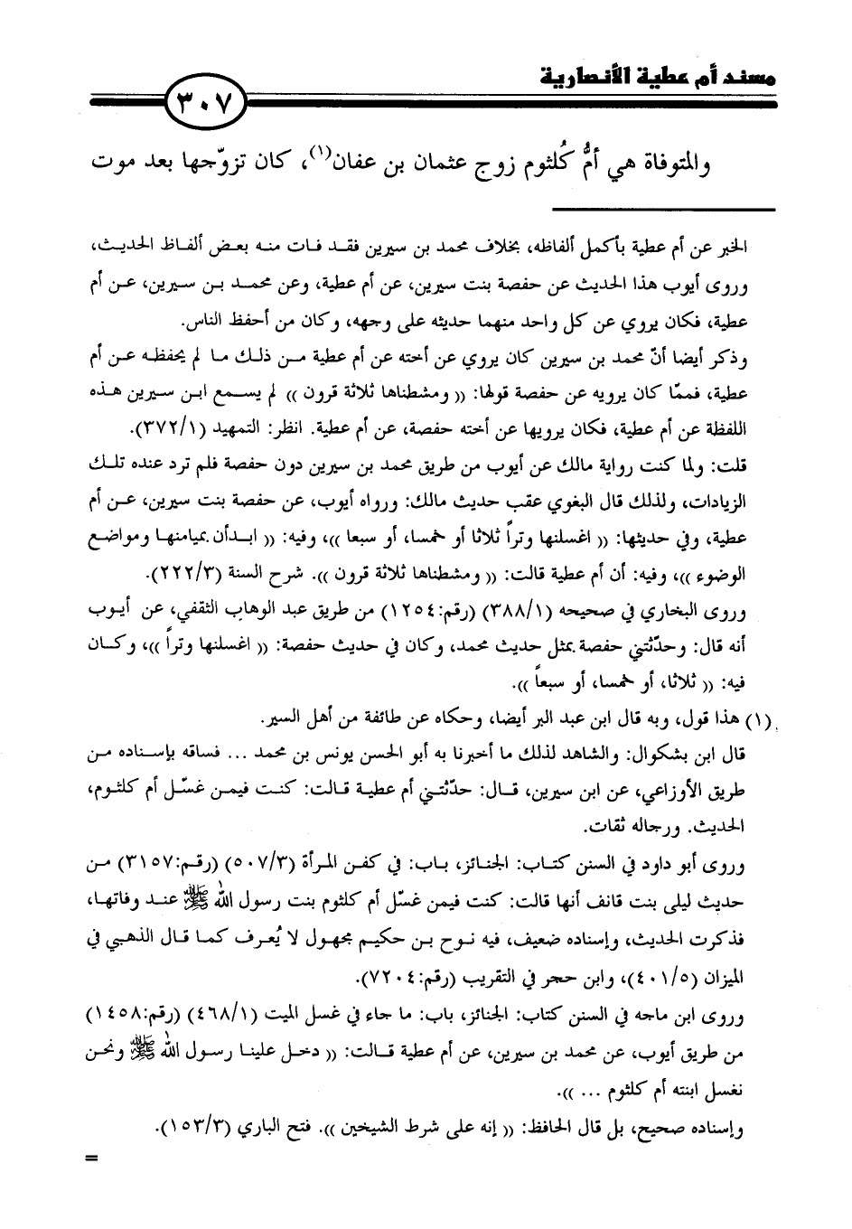قال ابن بشكوال: والشاهد لذلك ما أخبرنا به أبو الحسن يونس بن محمد ... فساقه بإسناده من طريق الأوزاعي، عن ابن سيرين، قال: حدثتني أم عطية قالت: كنت فيمن غسّل أم كلثوم، الحديث. ورجاله ثقات.
