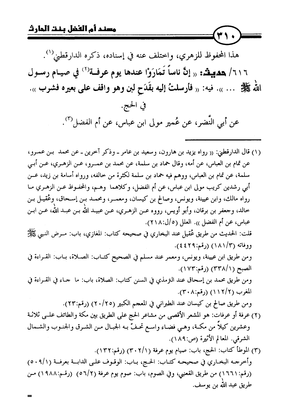 ٦١٦ / حديث: "إنَّ ناسًا تَمَارَوْا عندها يوم عرفة (٢) في صيام رسول الله - صلى الله عليه وسلم - ... ". فيه: "فأرسلتُ إليه بقَدَحِ لبن وهو واقف على بعيره فشرب".