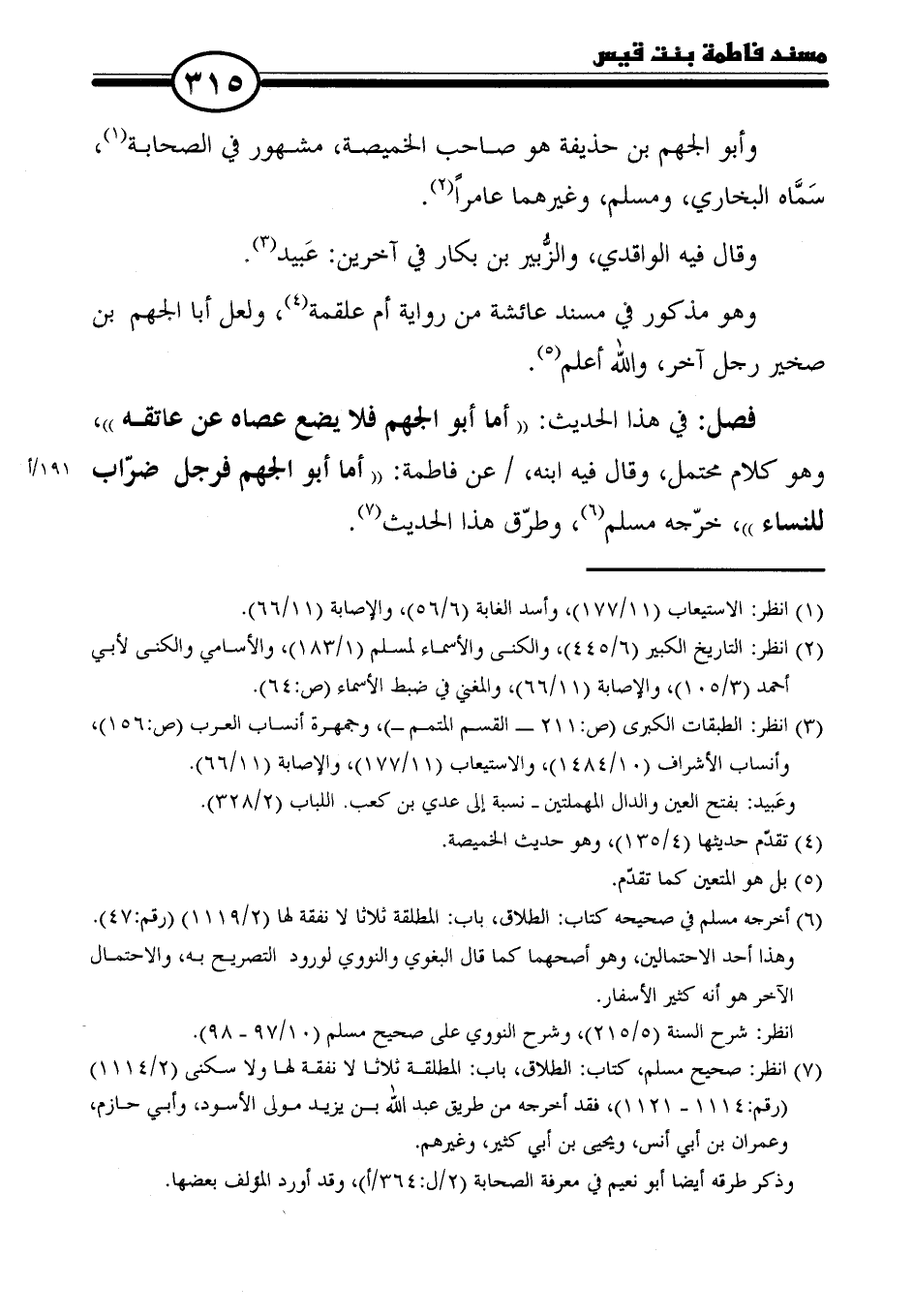 (٣) انظر: الطبقات الكبرى (ص: ٢١١ - القسم المتمم -)، وجمهرة أنساب العرب (ص: ١٥٦)، وأنساب الأشراف (١٠/ ١٤٨٤)، والاستيعاب (١١/ ١٧٧)، والإصابة (١١/ ٦٦).