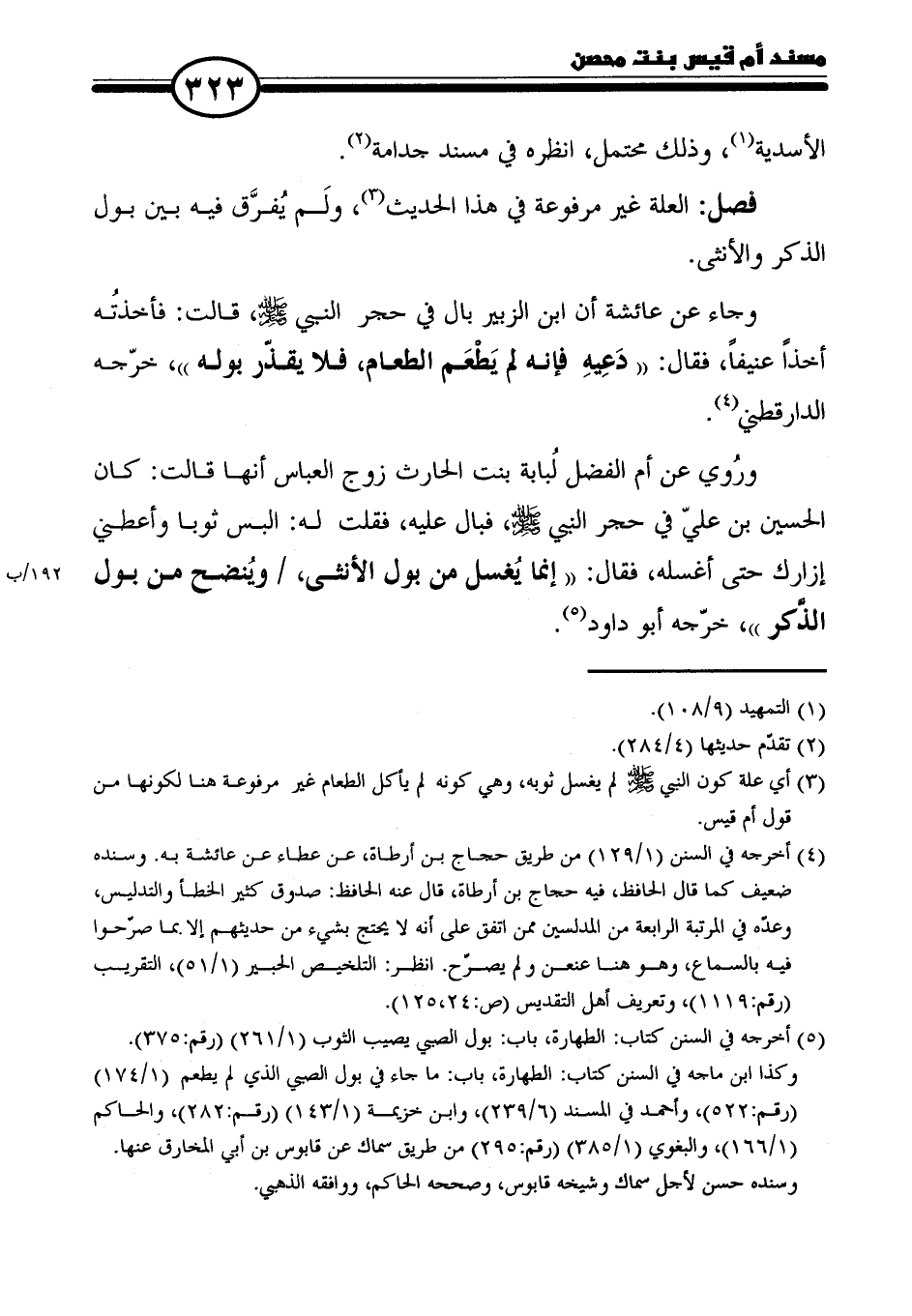 ورُوي عن أم الفضل لُبابة بنت الحارث زوج العباس أنها قالت: كان الحسين بن عليّ في حجر النَّبيّ - صلى الله عليه وسلم -، فبال عليه، فقلت له: البس ثوبا وأعطني إزارك حتى أغسله، فقال: "إنما يُغسل من بول الأنثى، ويُنضح من بول الذَّكر"، خرّجه أبو داود (٥).