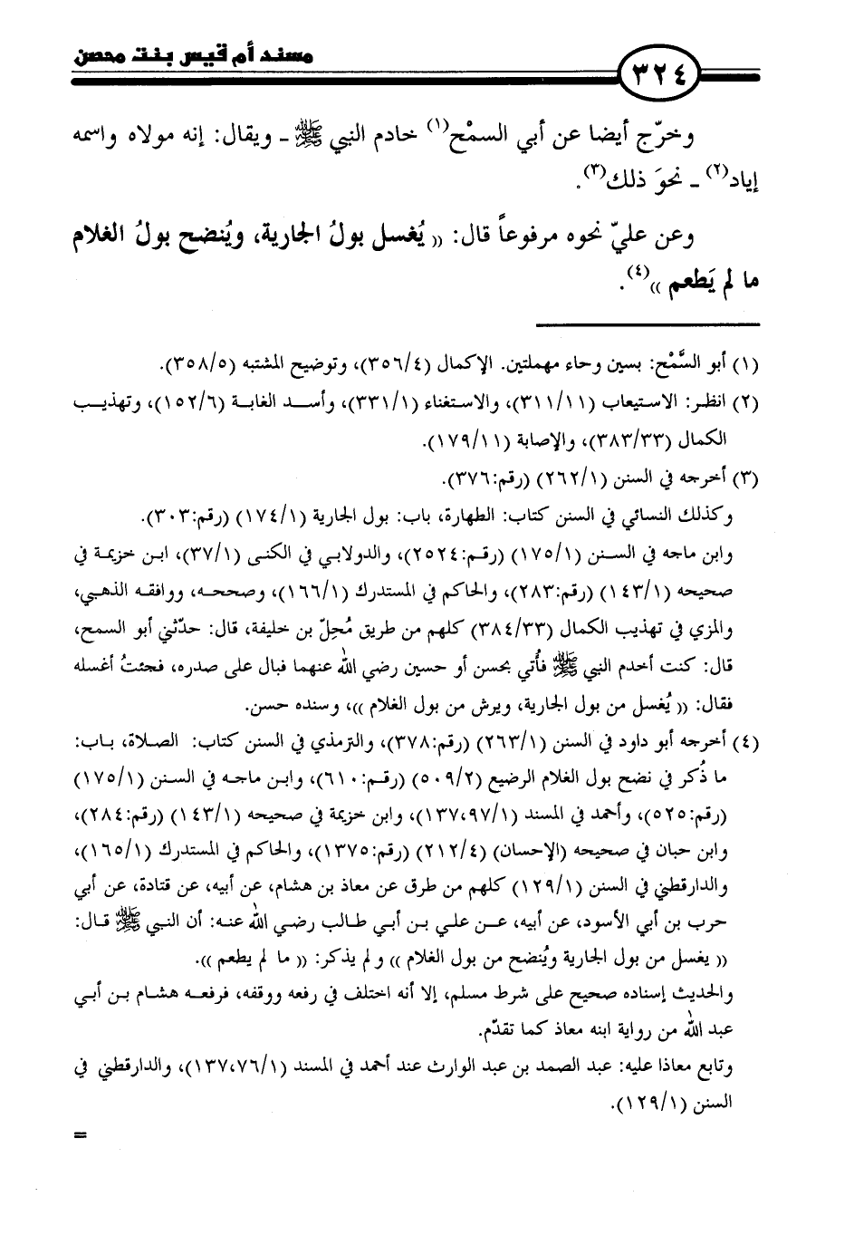 وابن ماجة في السنن (١/ ١٧٥) (رقم: ٢٥٢٤)، والدولابي في الكنى (١/ ٣٧)، ابن خزيمة في صحيحه (١/ ١٤٣) (رقم: ٢٨٣)، والحاكم في المستدرك (١/ ١٦٦)، وصححه، ووافقه الذهبي، والمزي في تهذيب الكمال (٣٣/ ٣٨٤) كلهم من طريق مُحِلّ بن خليفة، قال: حدّثني أبو السمح، قال: كنت أخدم النَّبيَّ - صلى الله عليه وسلم - فأُتي بحسن أو حسين رضي الله عنهما فبال على صدره، فجئتُ أغسله فقال: "يُغسل من بول الجارية، ويرش من بول الغلام"، وسنده حسن.
