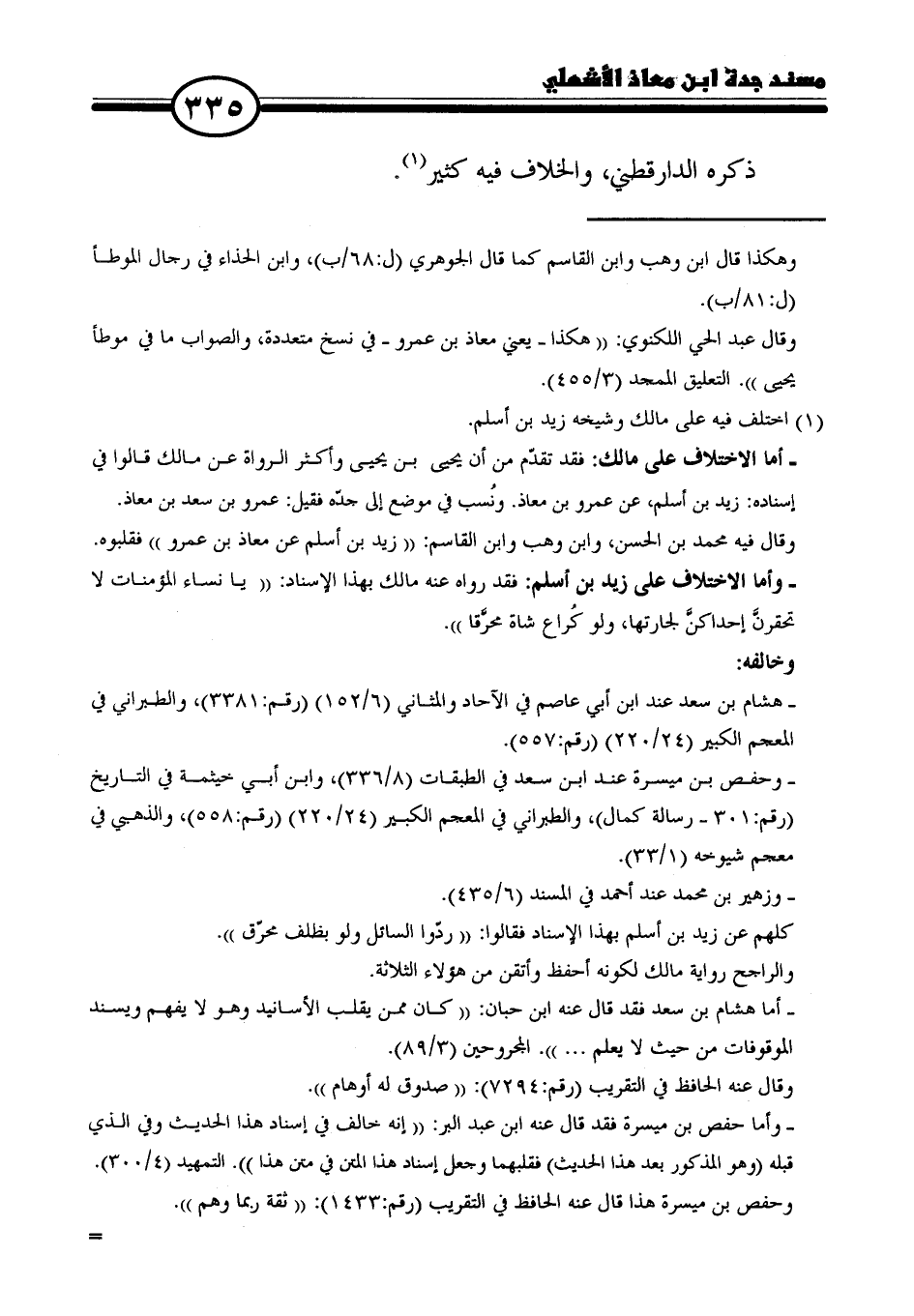 - أما الاختلاف على مالك: فقد تقدّم من أن يحيى بن يحيى وأكثر الرواة عن مالك قالوا في إسناده: زيد بن أسلم، عن عمرو بن معاذ. ونُسب في موضع إلى جدّه فقيل: عمرو بن سعد بن معاذ.