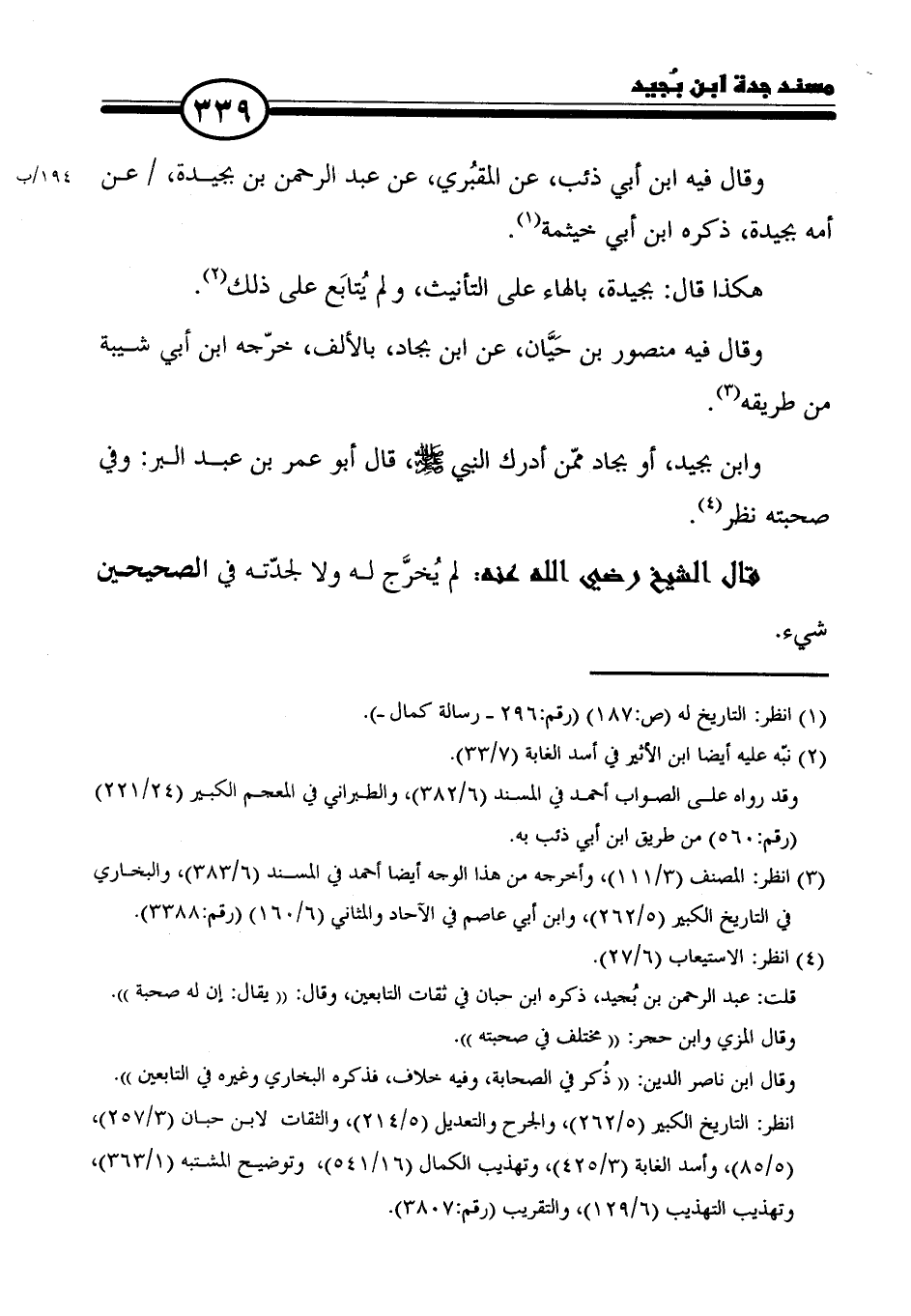 قلت: عبد الرحمن بن بُحيد، ذكره ابن حبان في ثقات التابعين، وقال: "يقال: إن له صحبة".