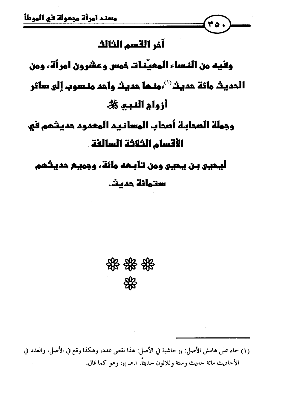 آخر القسم الثالث وفيه من النساء المعيَّنات خمس وعشرون امرأة، ومن الحديث مائة حديث (١)، منها حديث واحد منسوب إلى سائر أزواج النبي - صلى الله عليه وسلم - وجملة الصحابة أصحاب المسانيد المعدود حديثهم في الأقسام الثلاثة السالفة