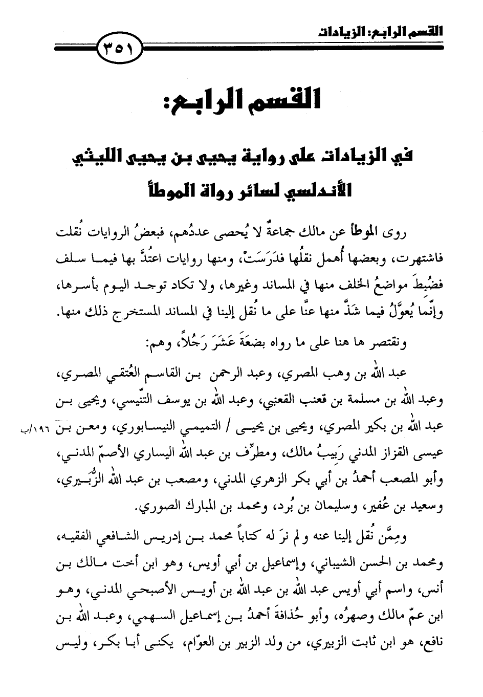 القسم الرابع: في الزيادات على رواية يحيى بن يحيى الليثي الأندلسي لسائر رواة الموطأ